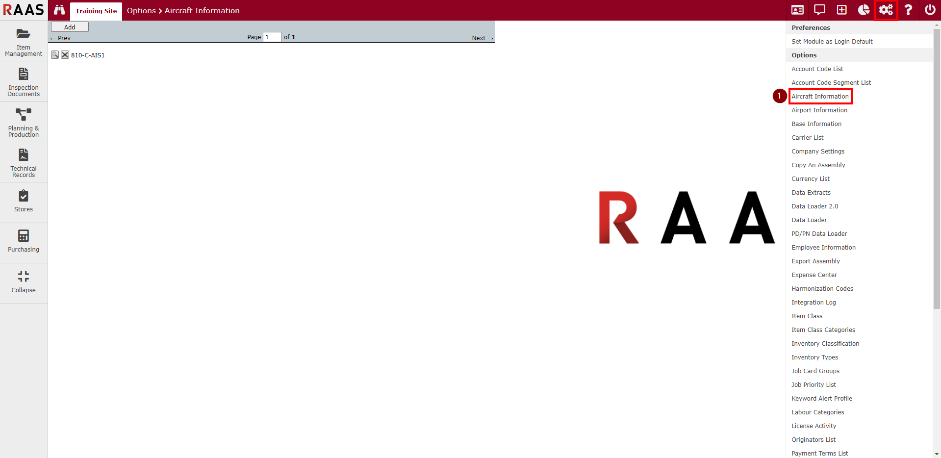 Click on the Settings icon and select Aircraft Information from the drop-down menu.