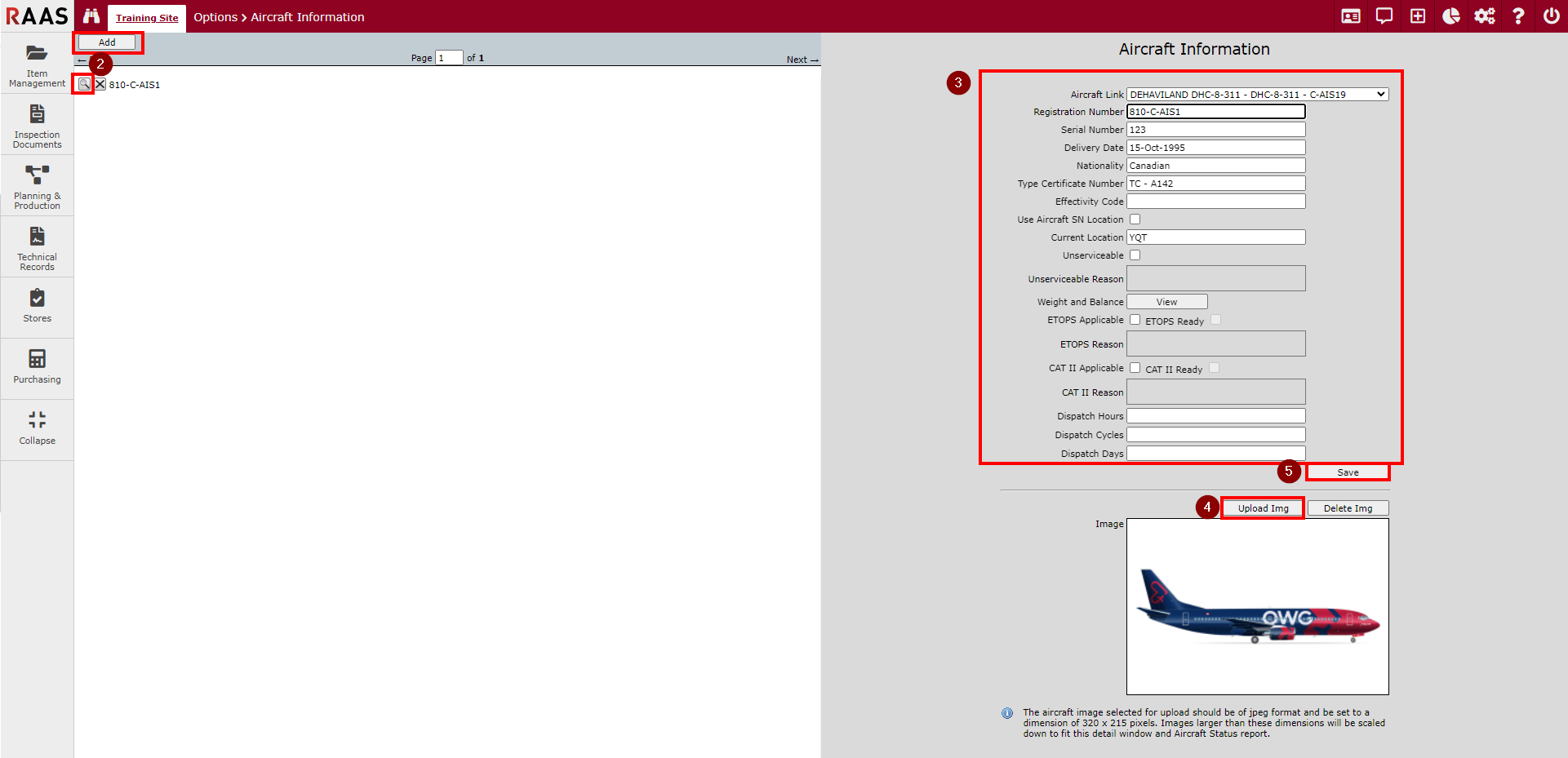 Click Upload Img to upload an image, if desired. This image is used in the Aircraft Status Report.