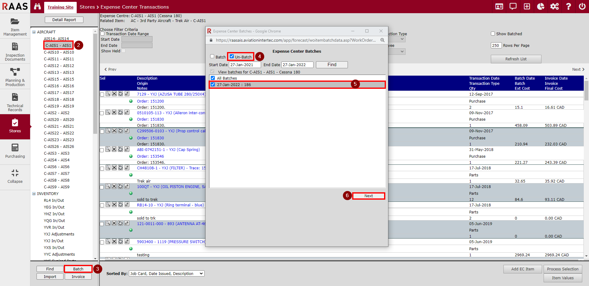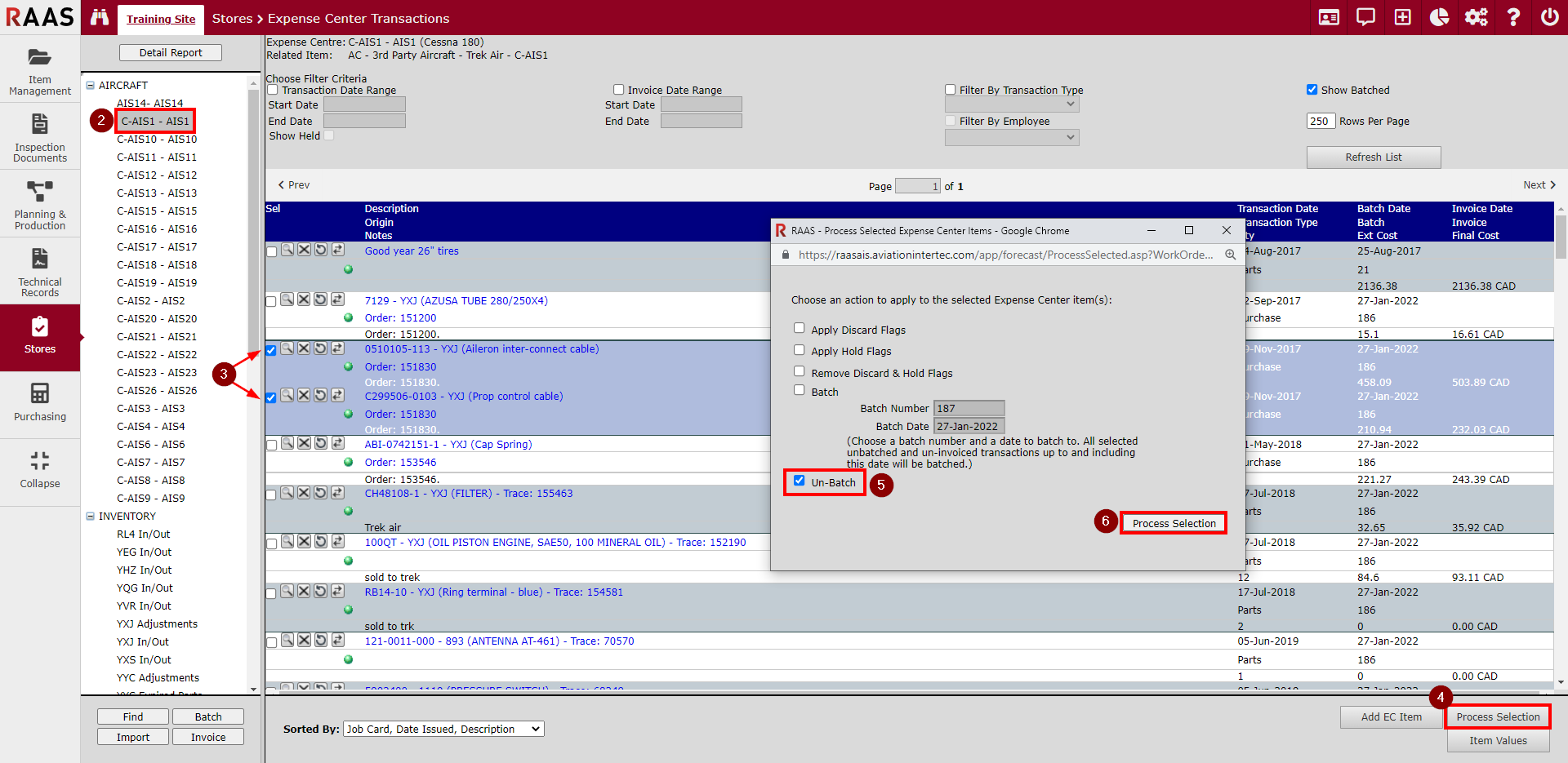 Un-Batching can only be completed for one Expense Center at a time. If an Expense Center has not been selected and the user attempts to un-batch, the listing will not populate. The user must first select the desired Expense Center Item from the list before attempting to un-batch.