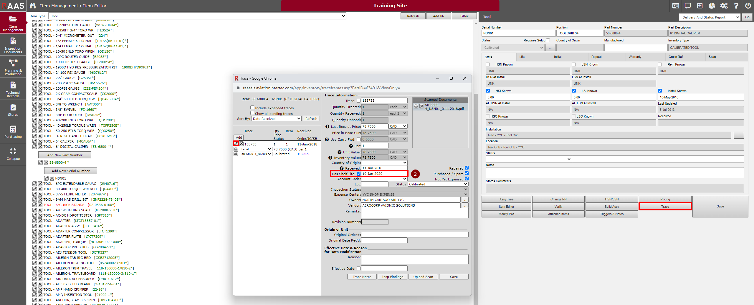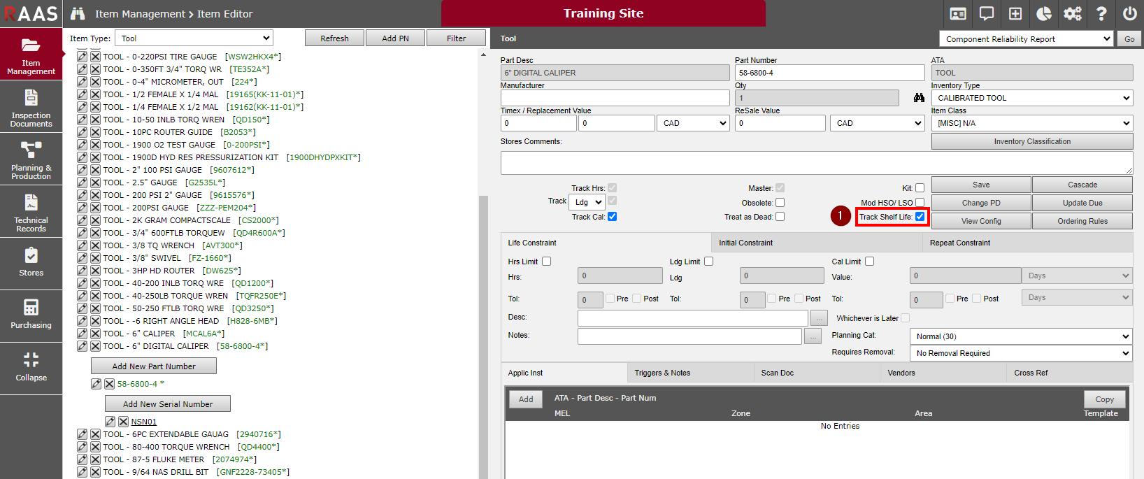 Shelf Expiry Configuration: Allows Tools due for calibration can be tracked using the Expired Parts List by selecting Location: Tool Crib and Inventory Type: Tool.