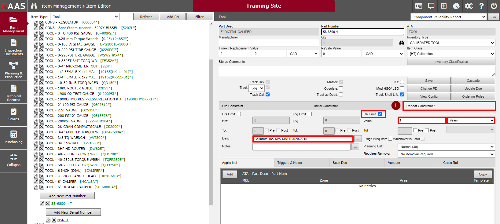 Edit the Part Number details to track a Repeat Constraint requirement to ‘Calibrate Tool IAW ____’