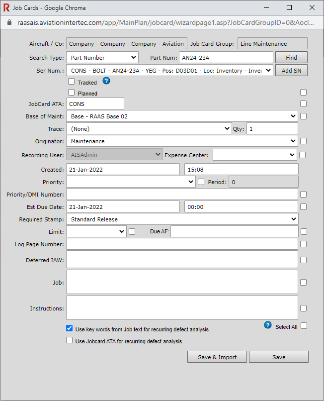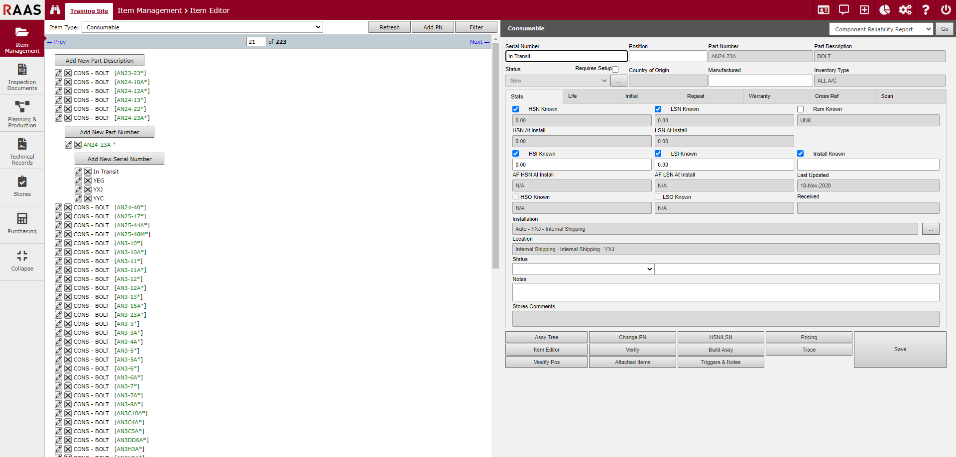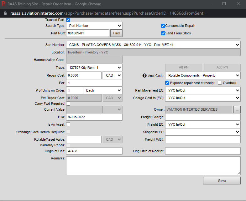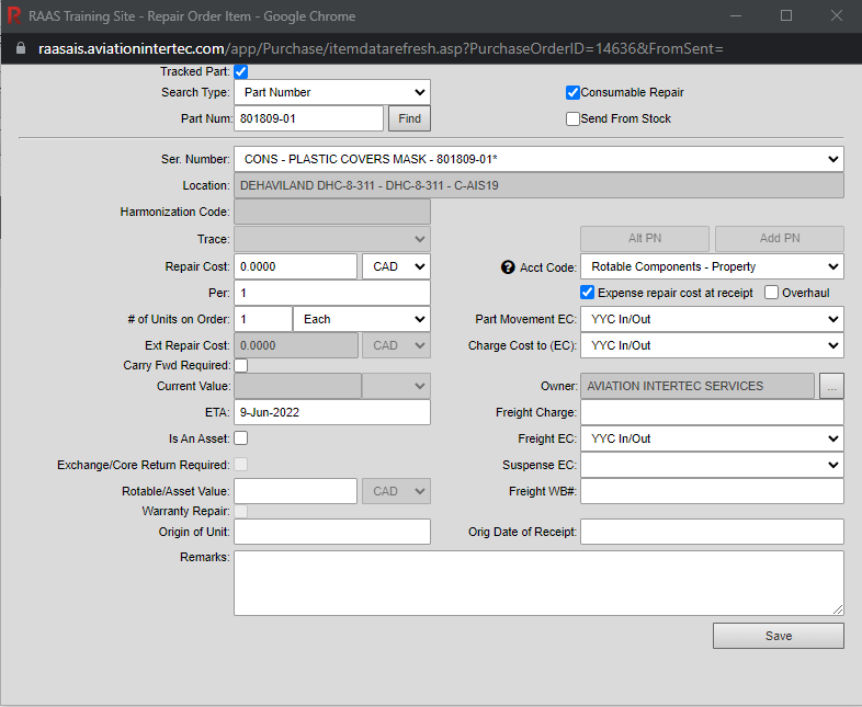 Consumables do physically get installed on aircraft and some can be repaired and used again. Consumables can be repaired in RAAS on Internal Repair Job Cards (IR JCs) and Repair and Warranty Repair Orders. However, because Consumables are simply expended and do not get installed, and because a Consumable Serial Number/Bin does not represent a specific part, typically the affected part of an IR JC or a Repair Order is not a specific Serial Number and Trace as it is for Serialized parts.