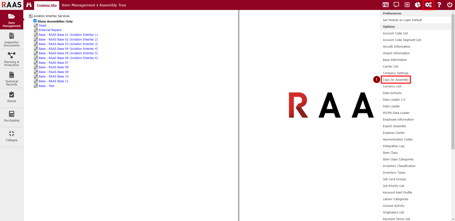 Click on the Settings icon and select Copy an Assembly from the drop-down menu.