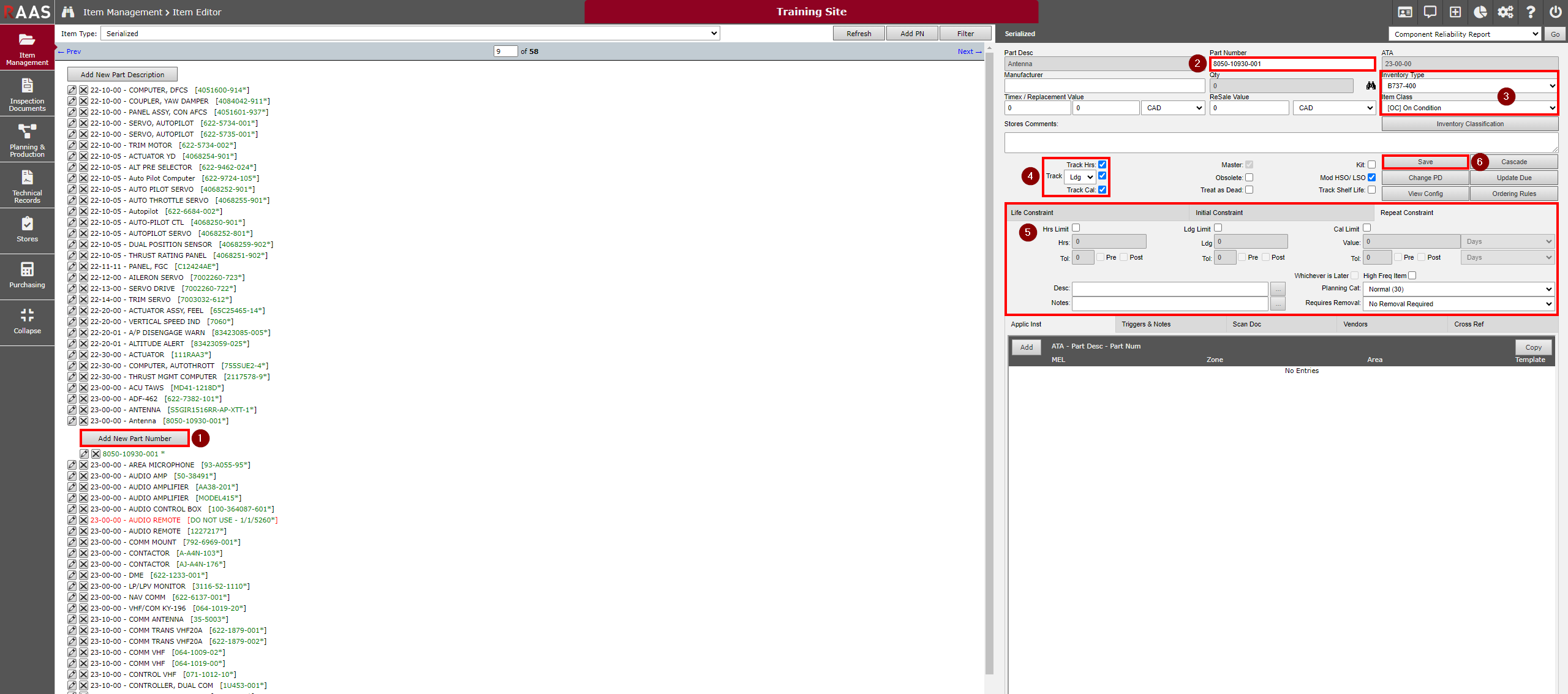 Enter the new part's Item Description and ATA; Select the appropriate check boxes to indicate the part's properties.