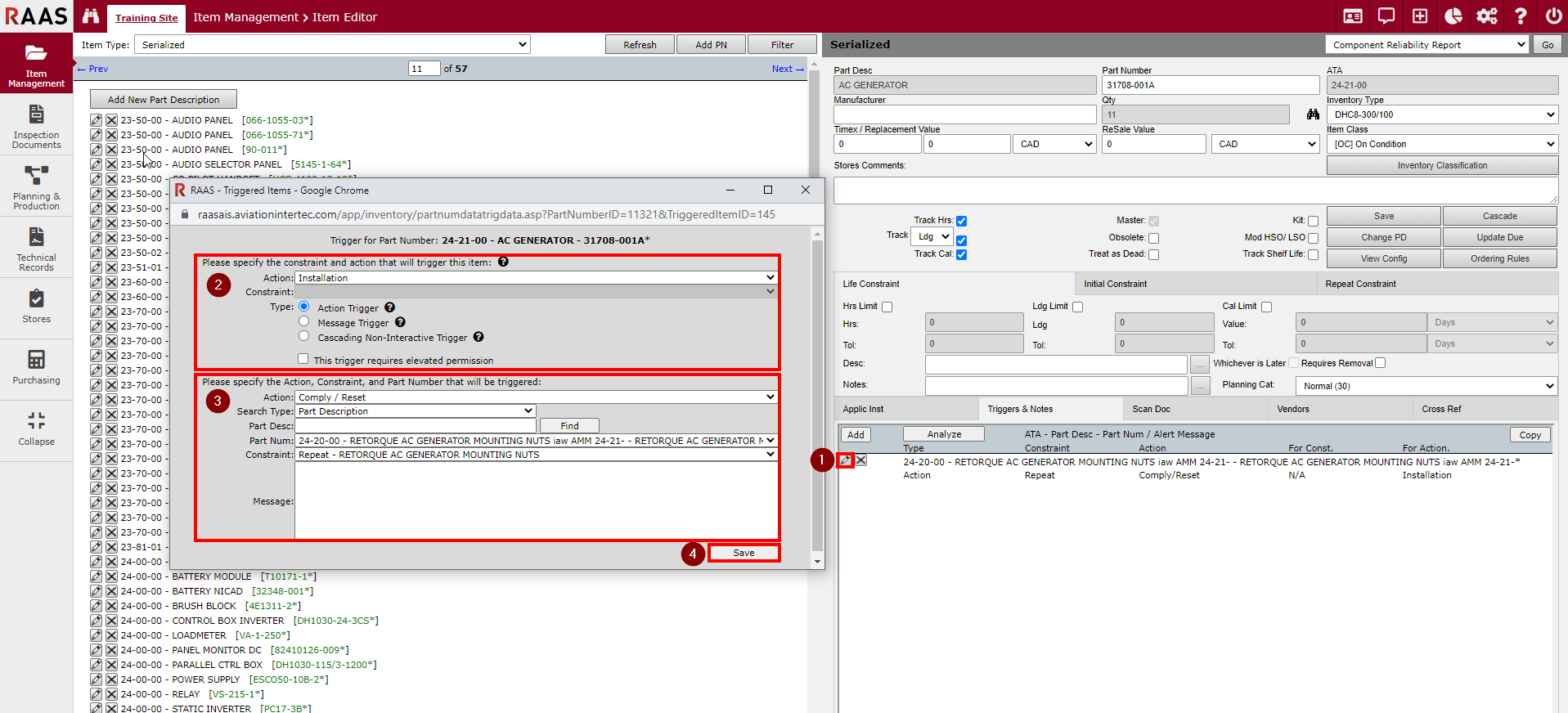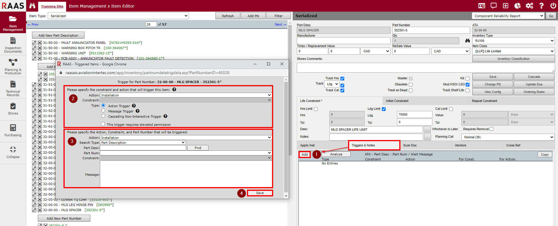 An example of a typical triggered item would be a corrosion inspection that accompanies a propeller installation. RAAS allows the user to associate the corrosion inspection job to the propeller installation job such that when the installation is complied with via TMI, the user is reminded to reset the corrosion inspection at the same time. Triggered jobs can be associated with the installation or removal of any part and with the compliance or reset of any constraint tracked by RAAS. Triggers can only be defined at the Part Number level from within Item Management's Item Editor sub-module and are applicable to all serial numbers under said Part Number.