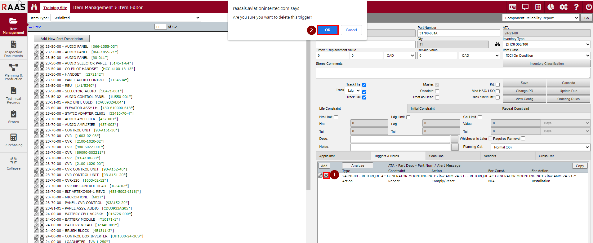 From the Triggers & Notes tab on the Part Number, click on the delete icon as shown in Figure 3.