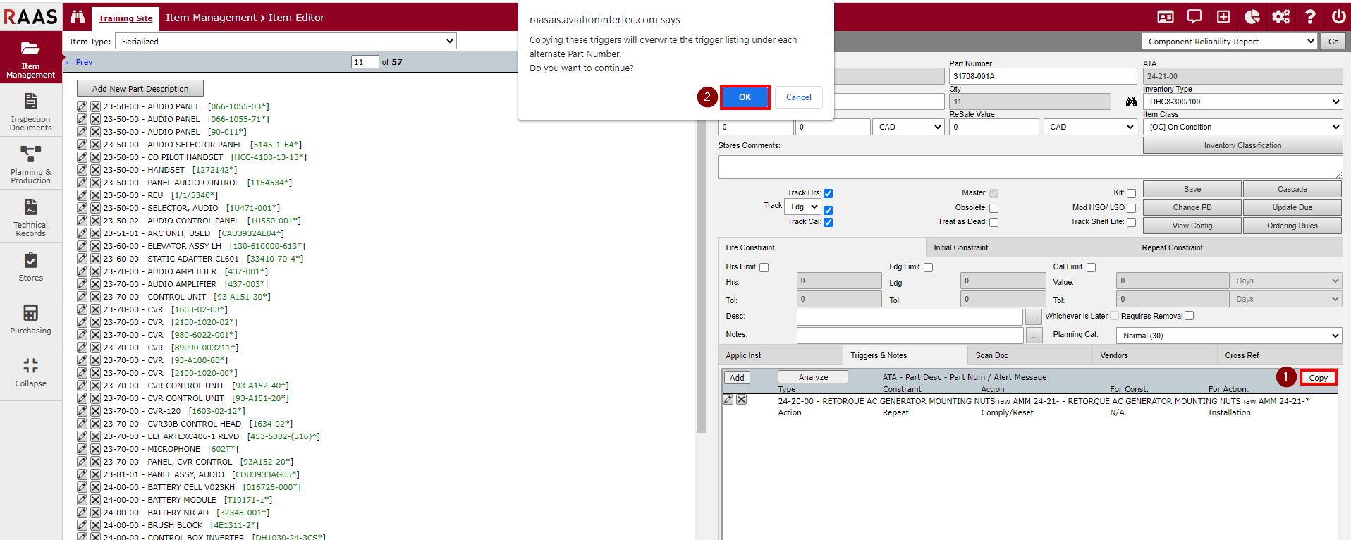 WARNING! Copying a Trigger will overwrite the trigger listing under each alternate Part Number with the triggers defined on the current Part Number. If the copy method is required for alternate Part Numbers with triggers defined, it is recommended that the trigger lists be reviewed for each alternate Part Number prior to copying. Make note of the Part Number and trigger details, which must be re-entered after the copy procedure has been completed.