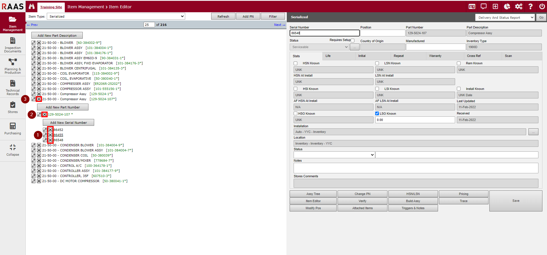 When there is more than one Part Number located under a Part Description, delete all associated serial numbers and that part number before moving on to the next Part Number in the list.