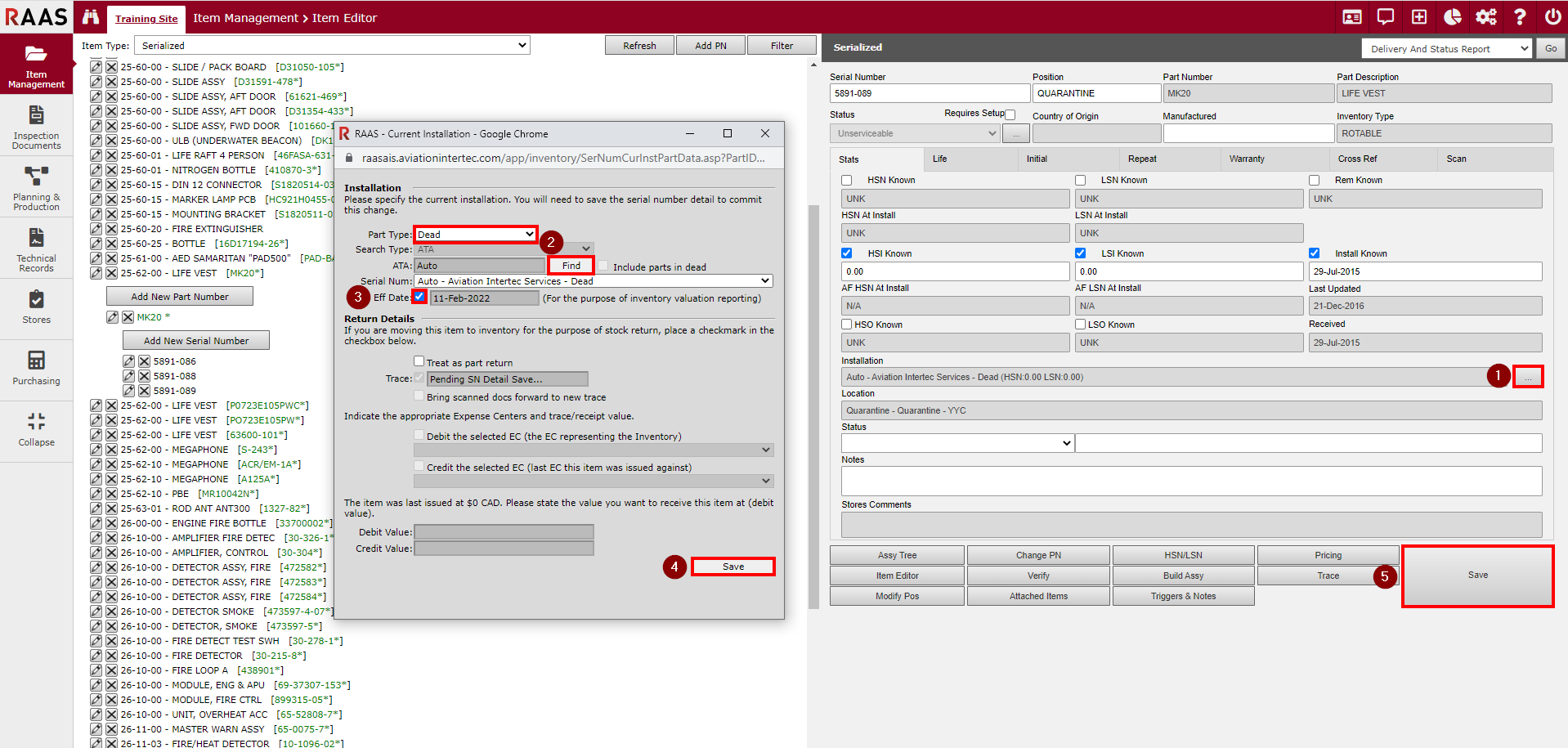 Repeat until all Serial Numbers associated to the targeted Part Number have been moved to Dead.