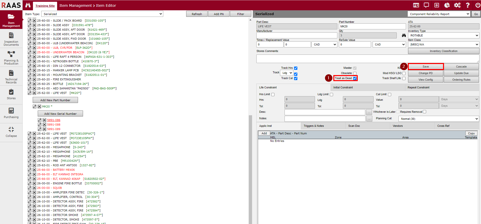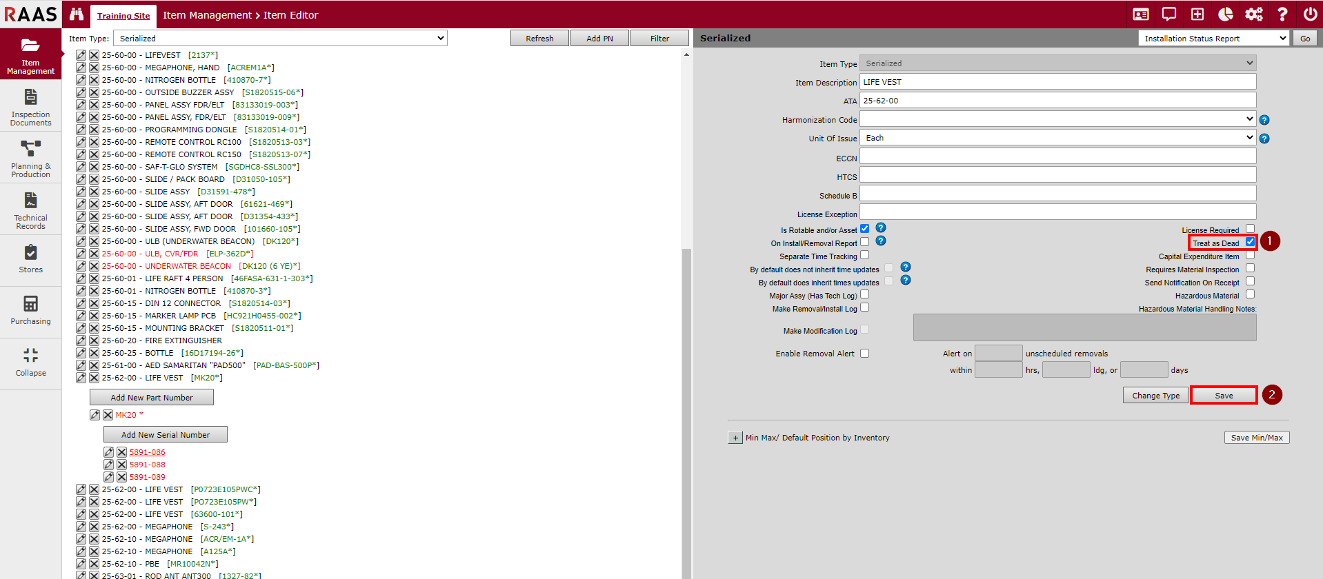 Serial numbers cannot be deleted once history has been accumulated. When this is the case, a serial number's current installation can be changed to Dead. If not all serial numbers under a part number can be deleted, the Treat as Dead flag can be checked at both the part number detail and part description detail screens. The Item Editor part listing can be filtered to show serial numbers in Dead and part numbers and part descriptions with Treat as Dead checked on.
