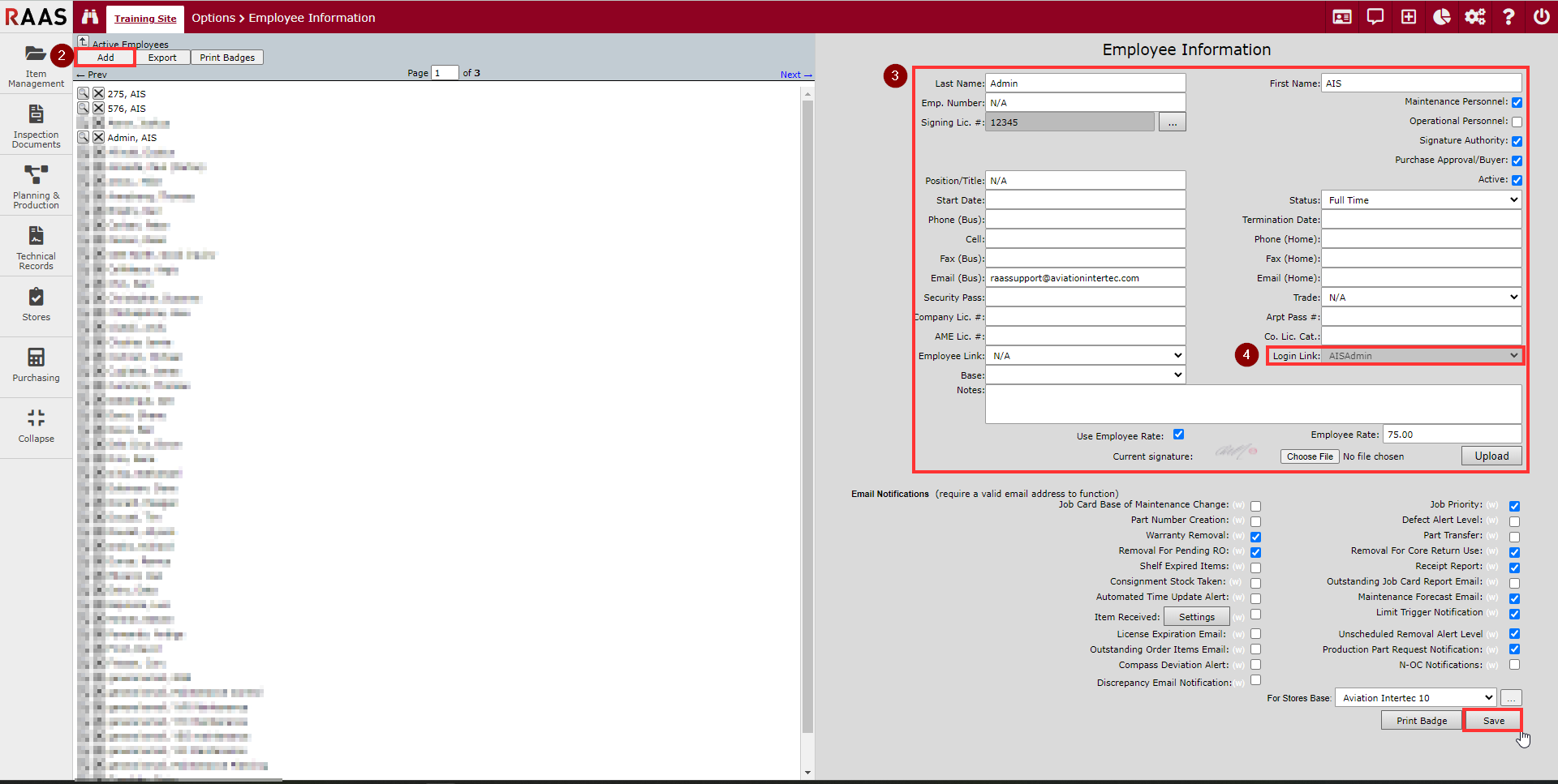 An Employee record is required for Maintenance Personnel who will be releasing aircraft, individuals responsible for approving purchases, and those users who wish to receive email notifications from RAAS.
