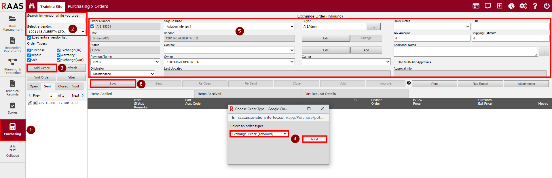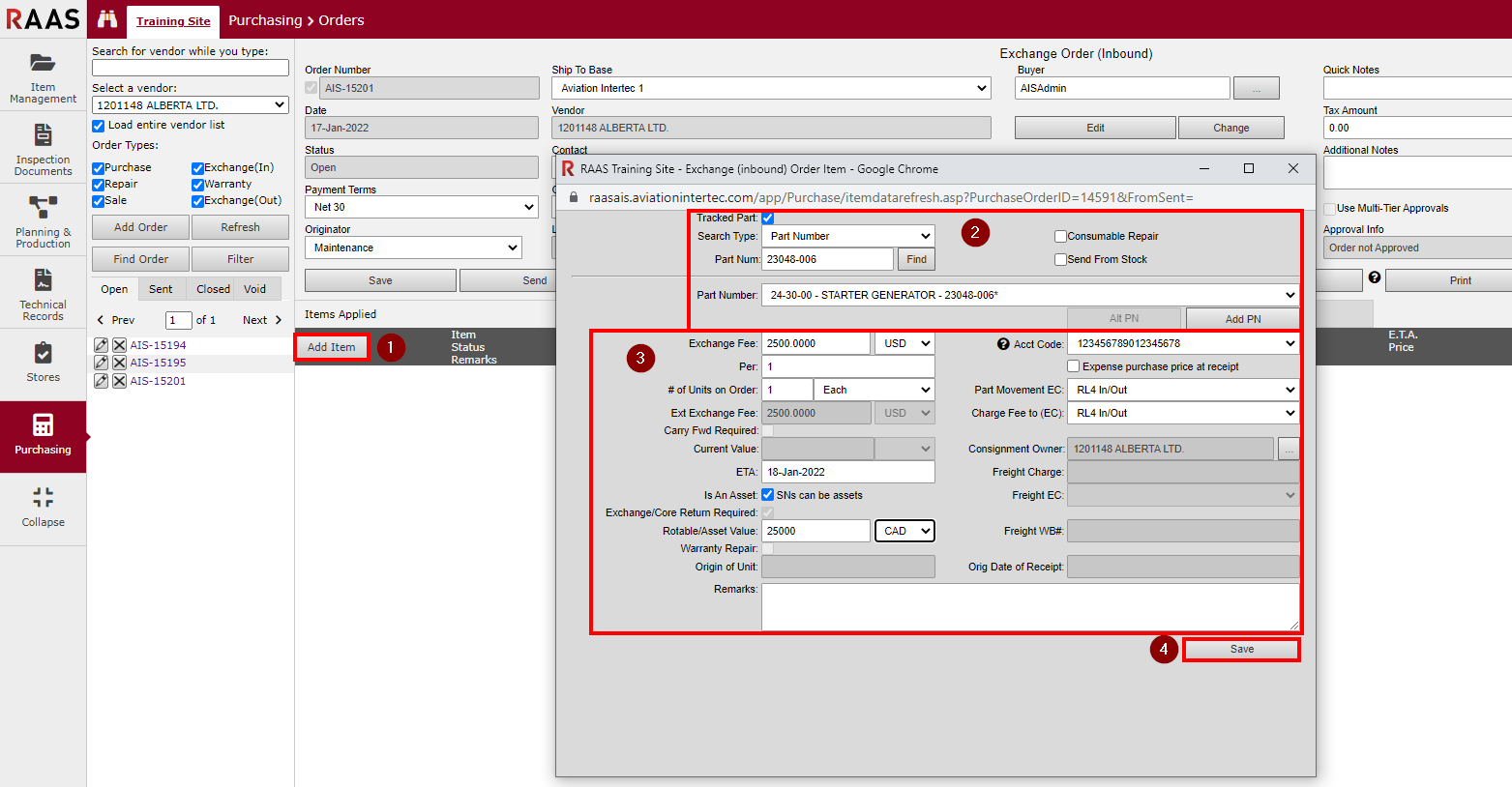 Exchange Orders are used when parts are being exchanged with a third party. An Inbound Exchange Order is used when a part is being received or borrowed from a vendor before sending an equivalent part back in return.