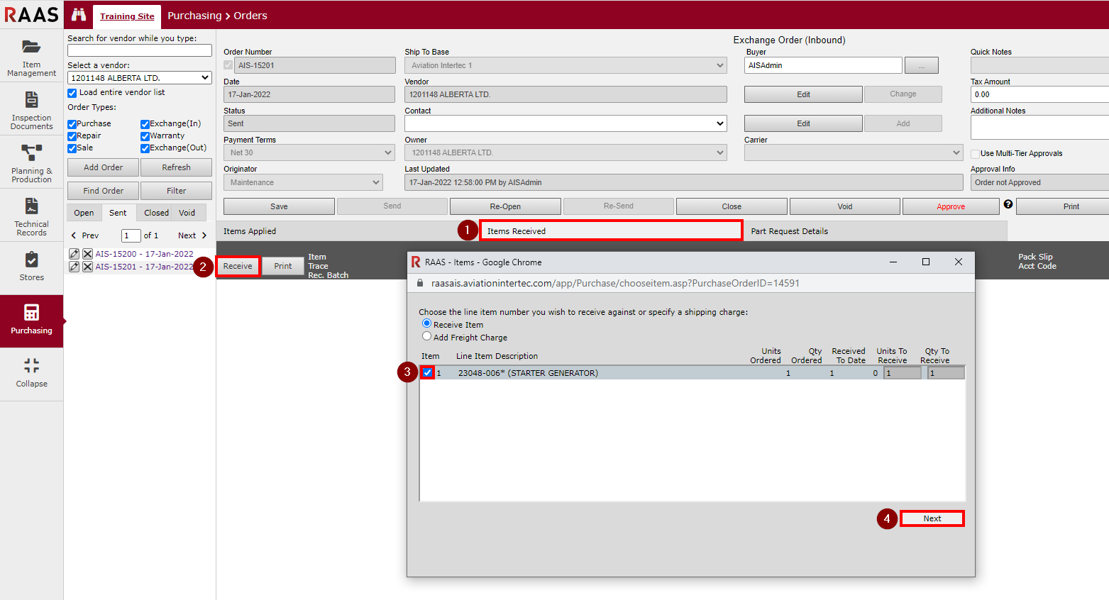 Once an item on an Exchange Order (Inbound) has been received from a vendor, the transaction must be recorded in RAAS. The Items Received tab, within the Orders sub-module, allows the receiver to track the receipt of items.
