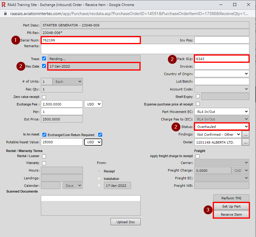 Receiving Items on an Exchange Order (Inbound) - Wizard Page 3 - Receive Item