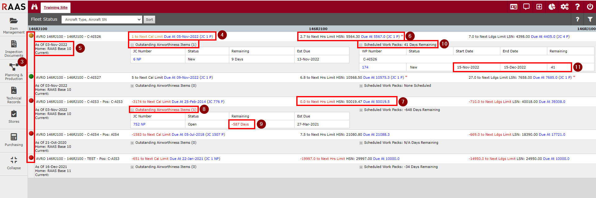 The output format of the RAAS Fleet Status view is somewhat customizable to customer requirements. Regardless of the specific output format, the objective of the Fleet Status view is to provide decision support relative to fleet availability by presenting all maintenance event and flight limitation data in a single comprehensive on-screen interactive report output. The Fleet Status view presents dynamic data, as current as is available in the RAAS database, and in this regard, it is significantly more timely than an equivalent paper or PDF fleet status report that may be produced only periodically.