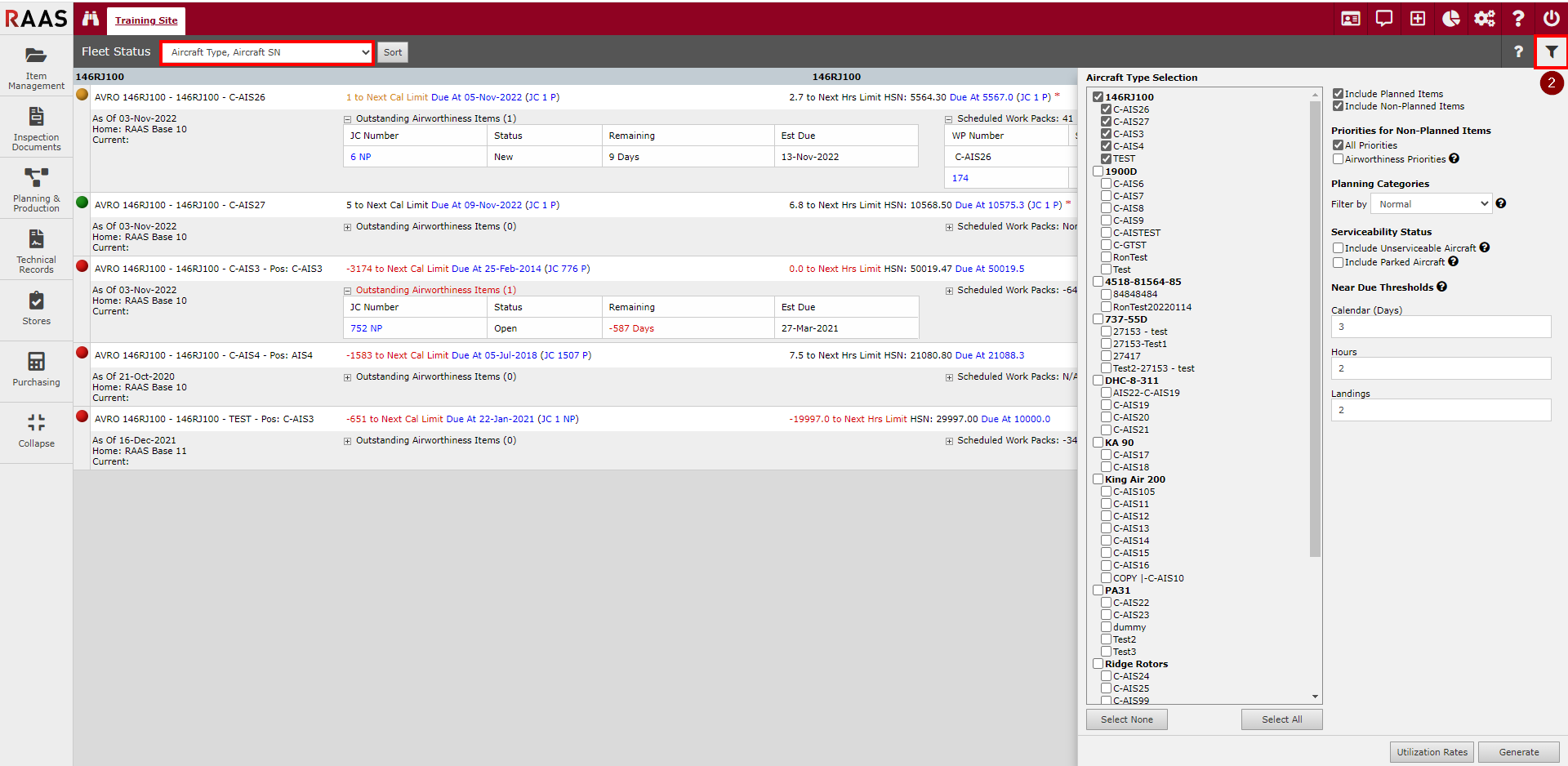 The view may be filtered (#2) by aircraft type or tail, job card type, priority, planning category, serviceability status, and near-due thresholds. Near-due thresholds can be set for Calendar, Hours, and Landings limits. Near-due items as defined by these thresholds are color-coded yellow throughout the Fleet Status view. Available sort criteria available include Aircraft SN, Most Hours Remaining, Most Landings Remaining and Most Calendar Remaining.
