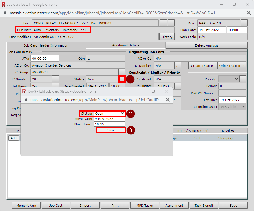 The most important part of the IR JC is the Affected Part. An IR JC cannot be processed when the Affected Part is not a PN that exists in RAAS or is in a location that cannot be moved back to Inventory.