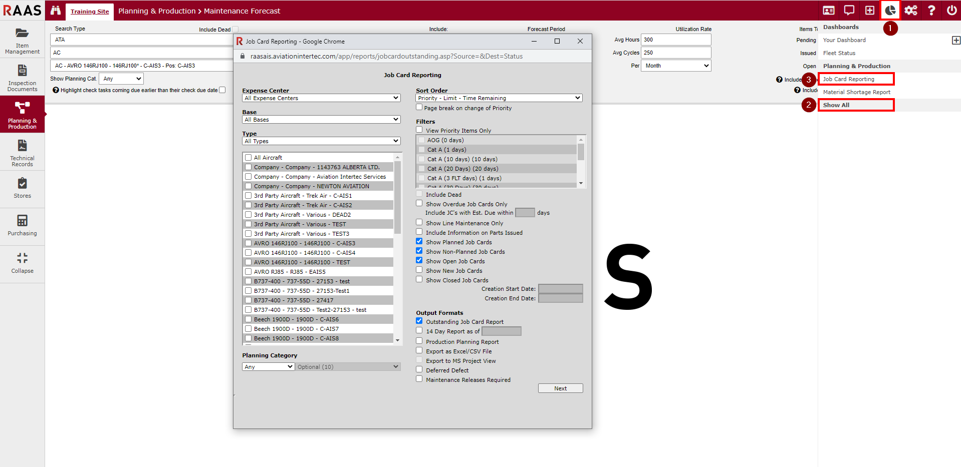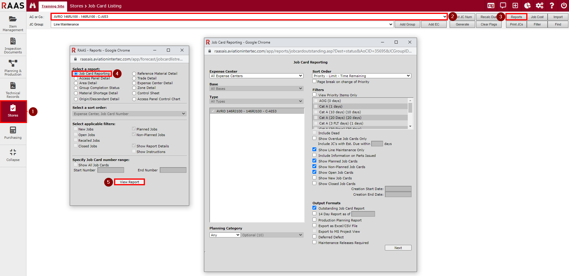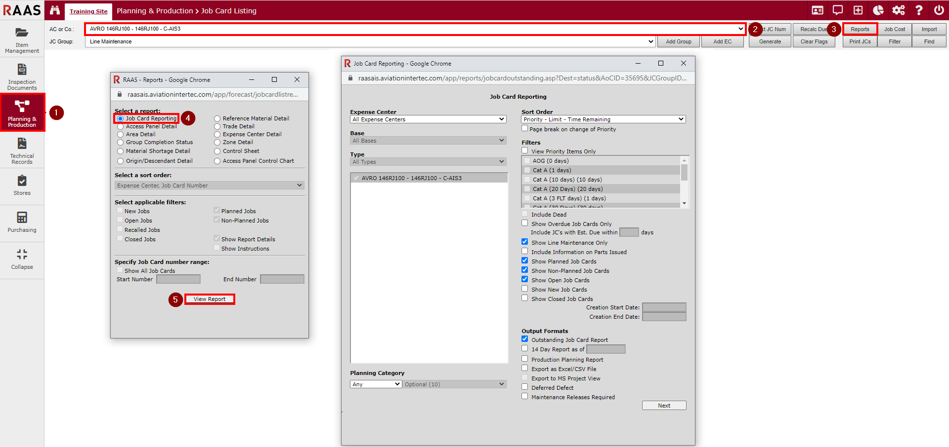 Running the report from the Reports and Dashboards menu allows reporting on multiple aircraft while running the report from the Job Card Listing submodules in Planning and Production or Stores allows reporting on a single aircraft.