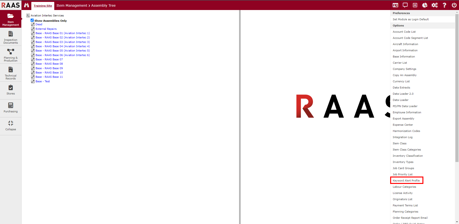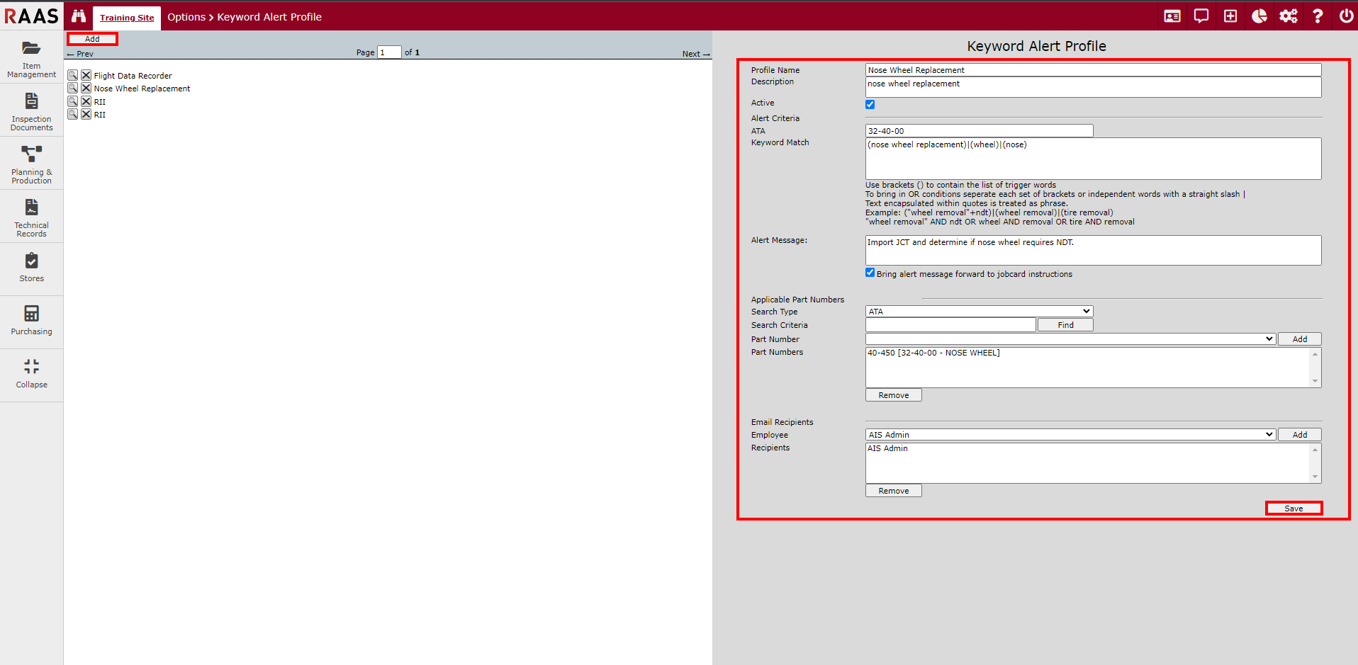 Keyword Alert Profiles are used as a tool to alert users of something that may have to be done, such as Non-Destructive Testing (NDT), when creating a non-planned job card. Based on the affected part selected and keywords entered in the Job field when creating a Job Card, RAAS will present the alert message.