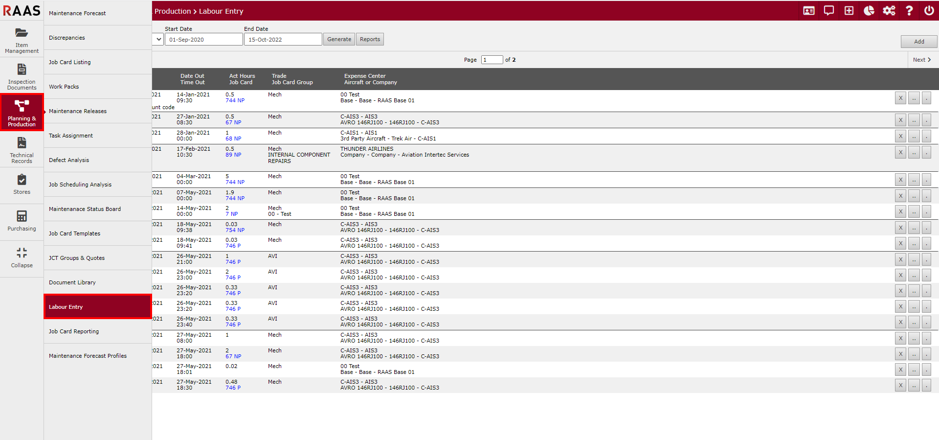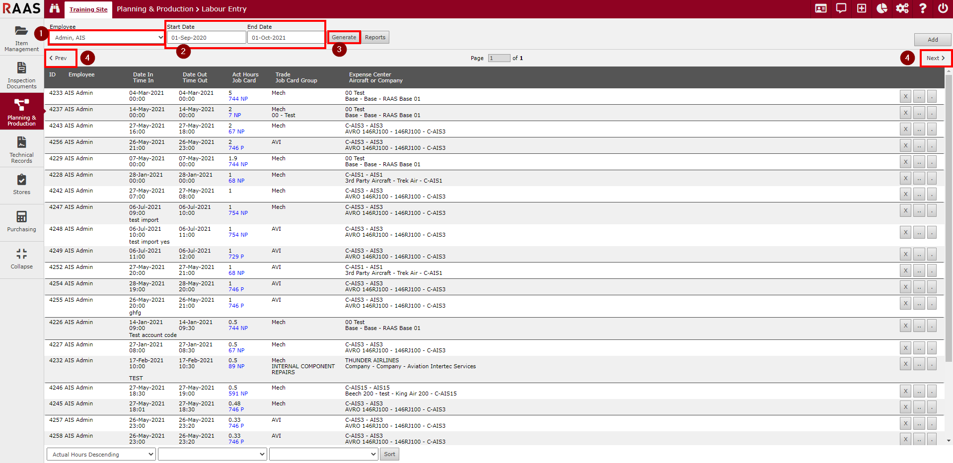 Use the Prev and Next arrows to view multiple pages of labour entries.