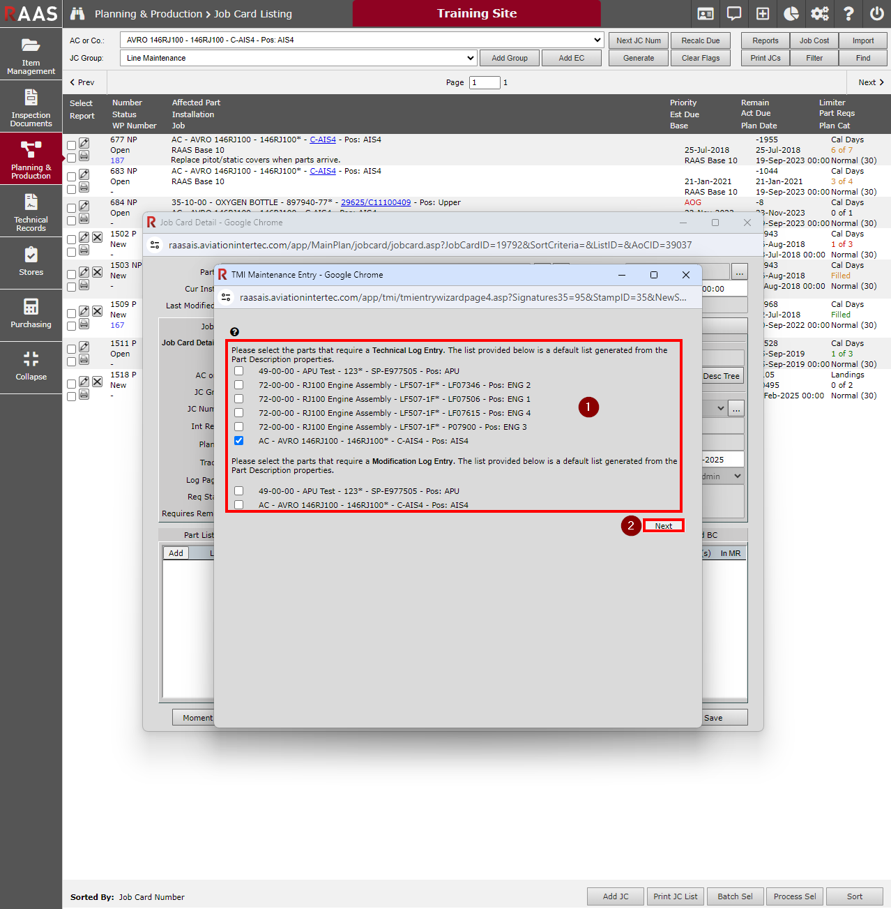 The appropriate Technical and Modification Logs will be preselected based on the current installation of the affected part of the Job Card. For example, if an inspection is on an engine, both the engine and aircraft Tech Log should be preselected by default, as long as the “Major Assy (Has Tech Log)” flags are selected on the Part Description of the engine and the aircraft.