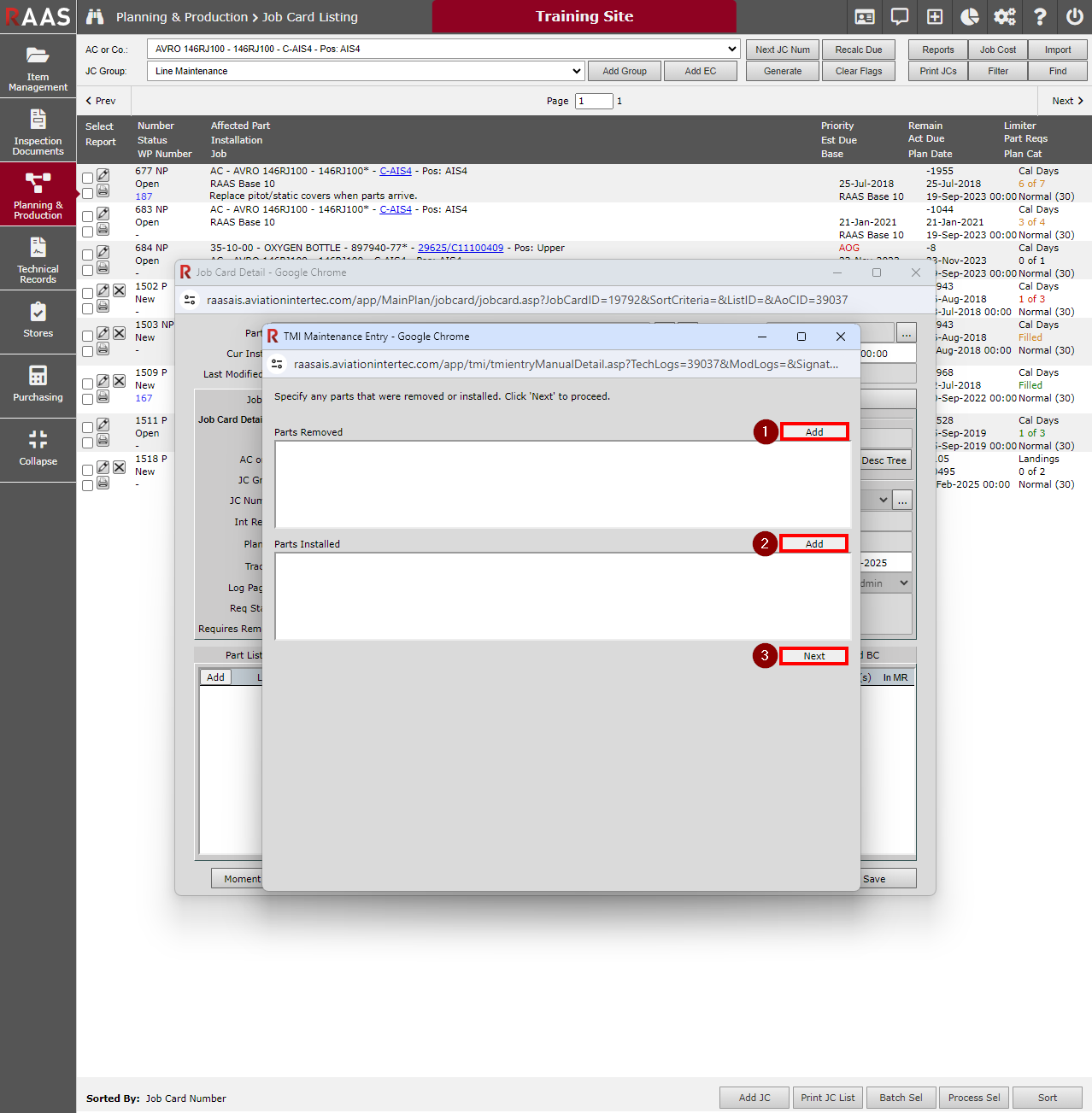 For the Parts Removed search window, users will only be able to find parts that are currently installed on the aircraft at the time of entry.
