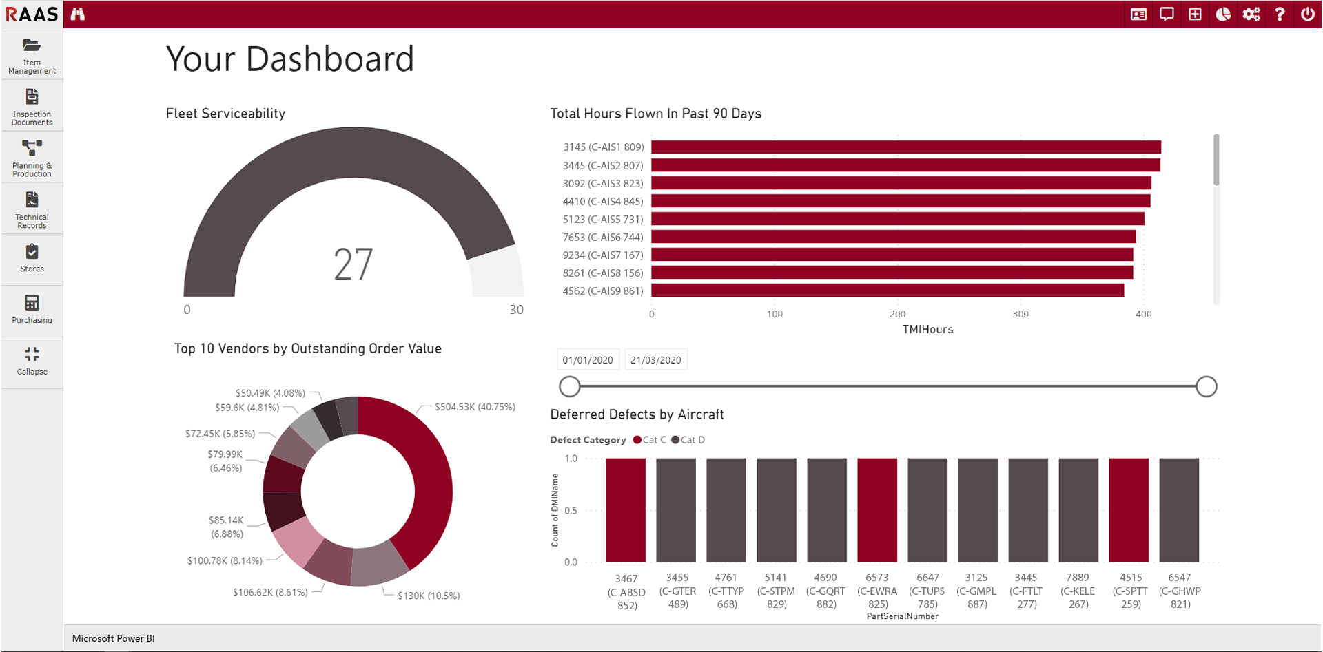 Reports and Dashboards is a menu including your Dashboards, Fleet Status, and a list of Reports categorized by module. The Report list can be viewed for all modules (Show All) or for the module currently on-screen (Show Less). Custom Dashboards can be created to suit your company’s needs.