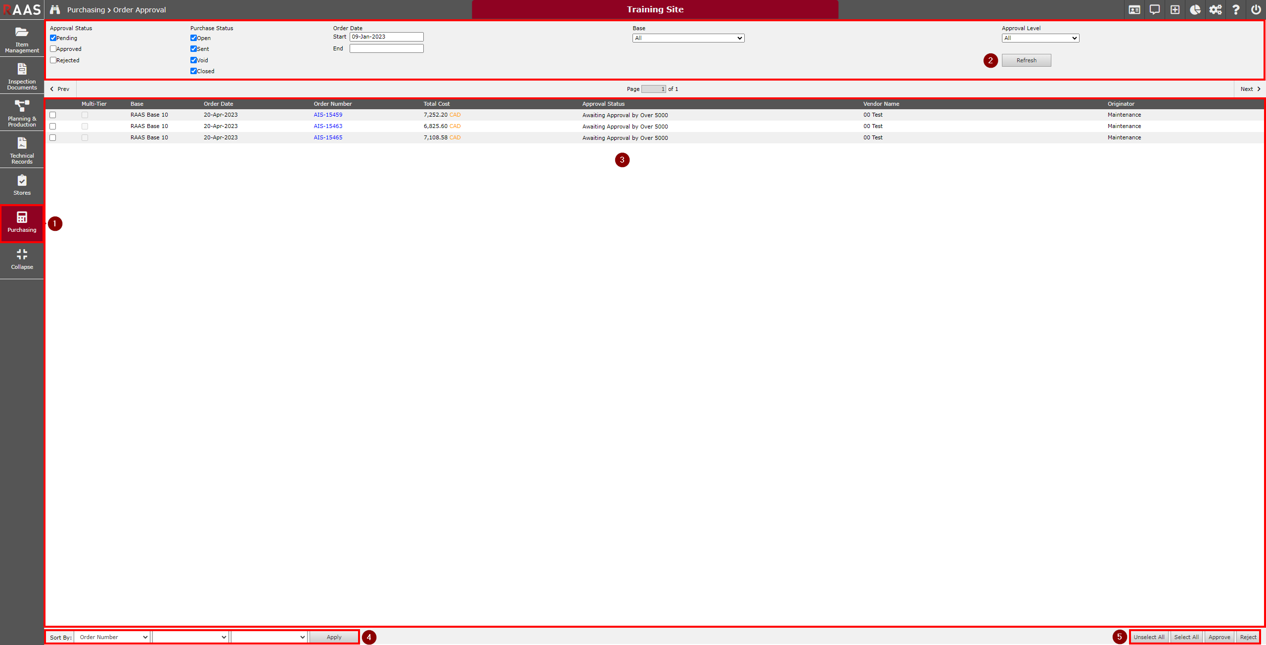 The Order Approval sub-module in Purchasing is used to view, approve, and reject orders awaiting approval.