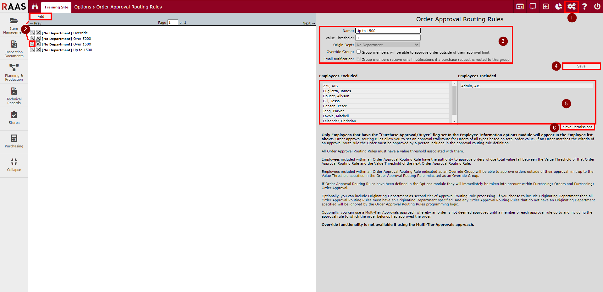 The Order Approval Routing Rules page allows users to set an approval trail/route for Orders of all types based on total order value. If an Order matches the criteria of an approval routing rule the Order must be approved by a person included in the approval routing rule definition.
