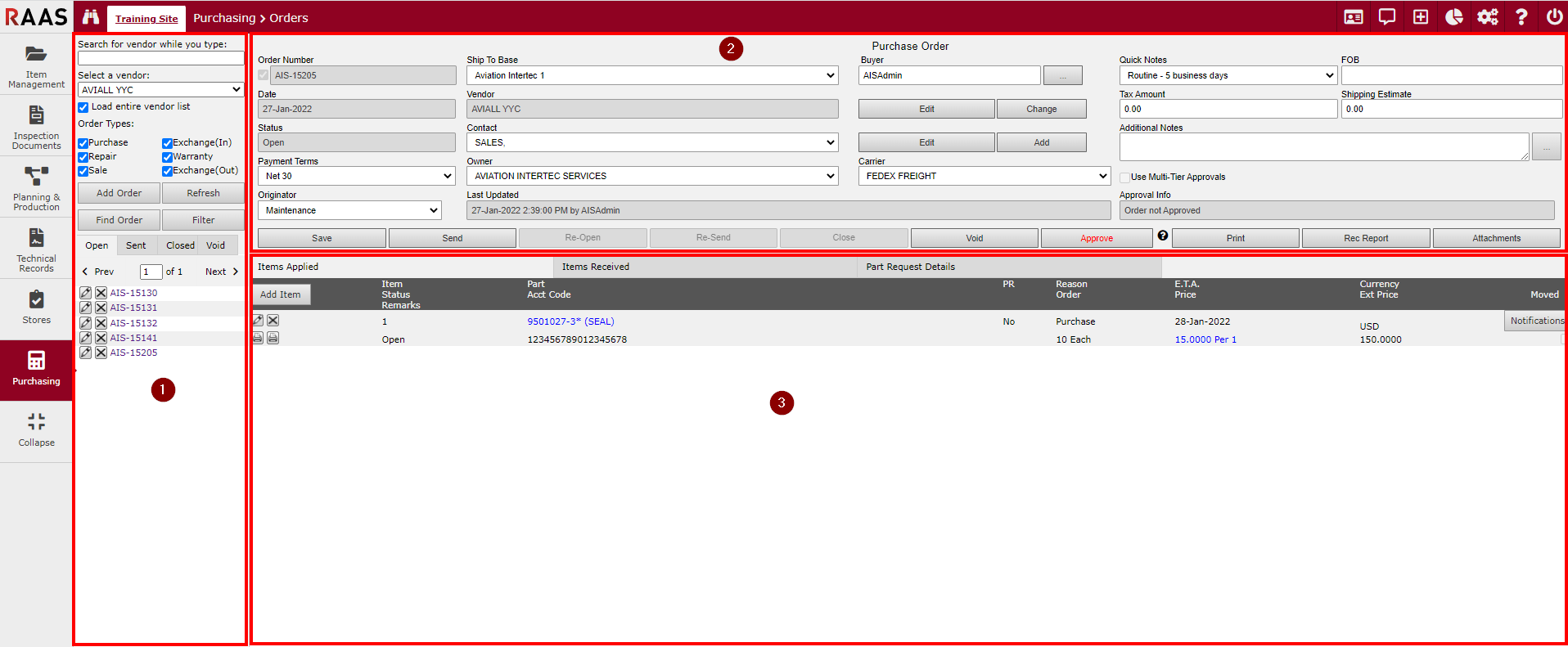 The Orders sub-module is the main hub of Purchasing. It is from this sub-module that a purchaser can create, modify, send, receive, close or void Purchase, Exchange (Inbound), Repair, Warranty Repair, Sales, and Exchange (Outbound) orders. It is comprised of the following sections: