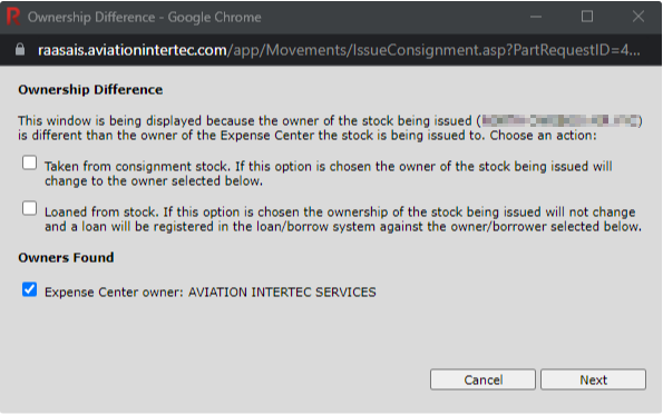 If the ownership of the Trace being issued is different than the customer of the expense center to which the Trace is being issued, the Ownership Difference window will appear and the user must indicate whether the part is being “Taken from consignment stock” (one company is selling the part to another) or the part is being “Loaned from stock” (one company is borrowing the part from another).