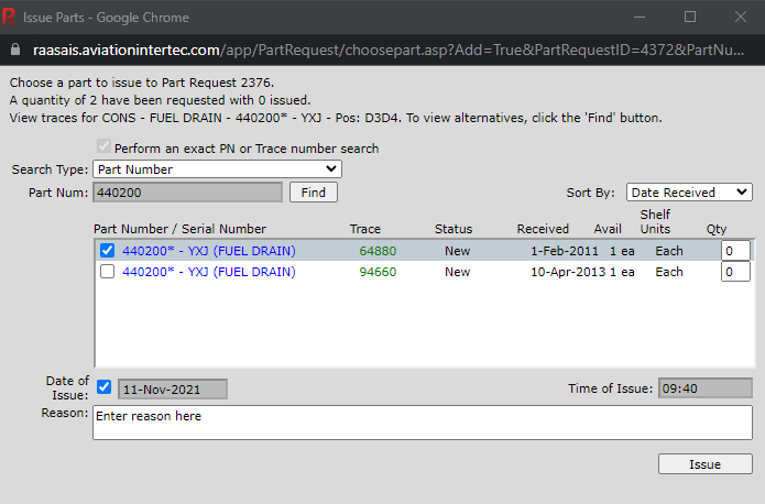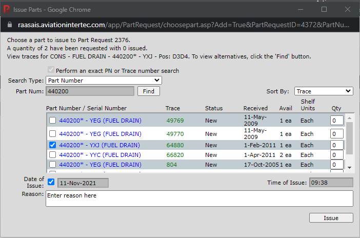 Select the Trace to be issued and if issuing a consumable part enter the quantity to be issued. Note: Traces must be issued one at a time.