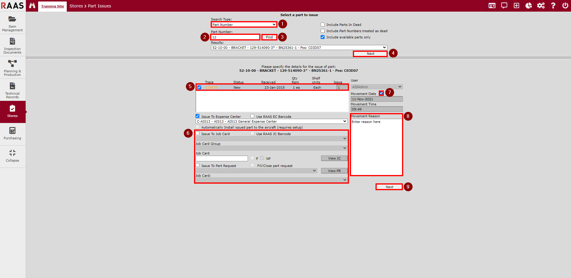 Issue To Expense Center, Issue To Job Card, and Issue to Part Request.