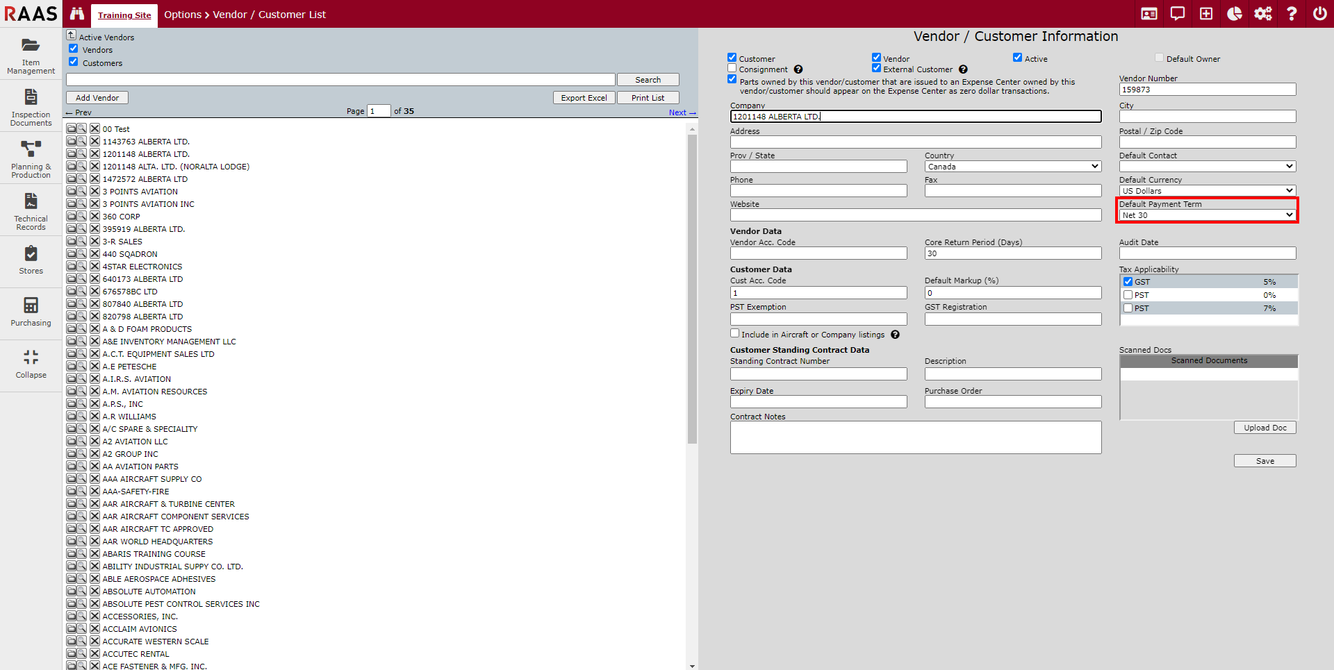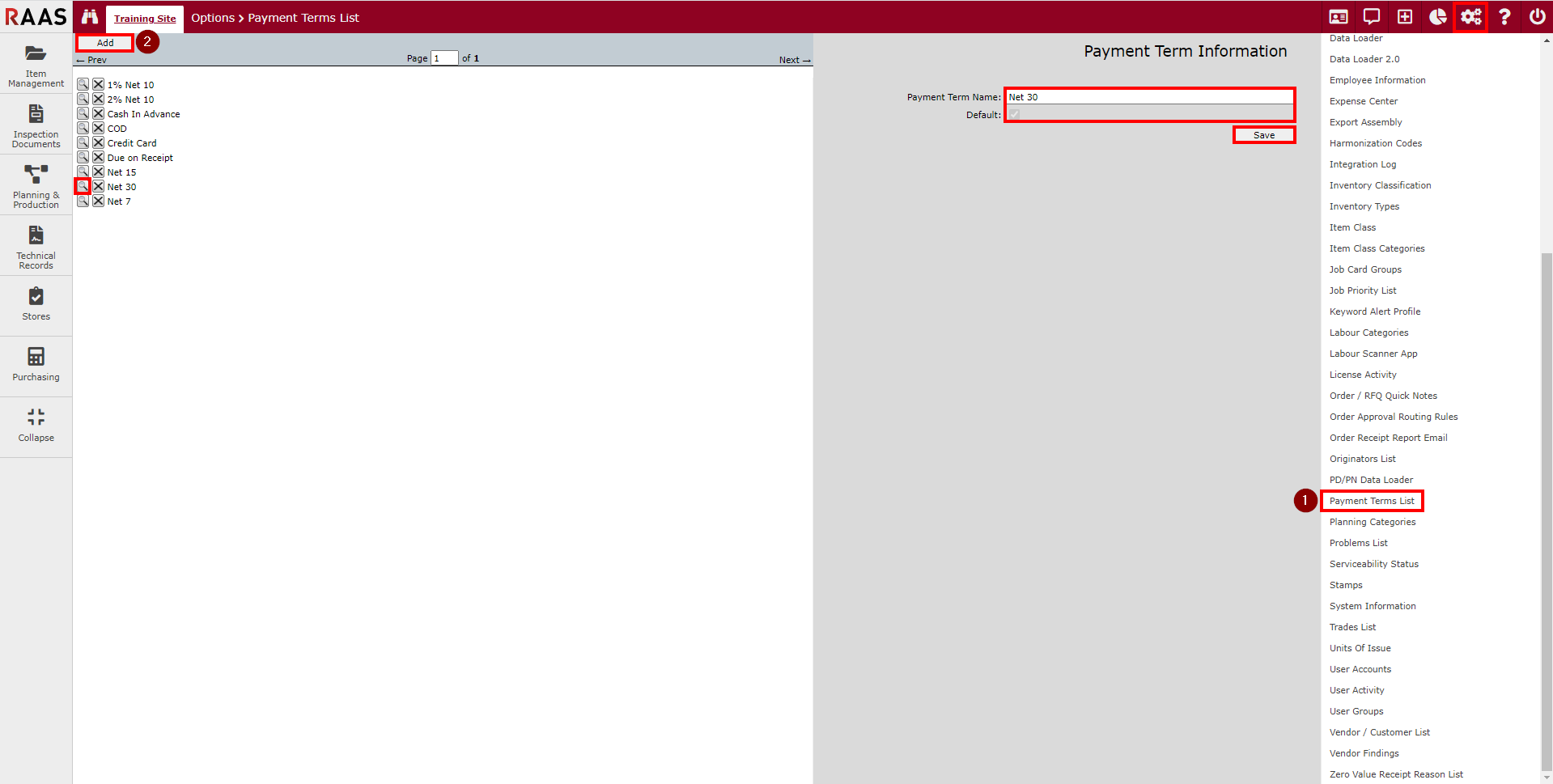 Payment Terms are used on Orders in RAAS to set expectations for payment. Payment terms can be added or removed from the Payment Terms List and one payment term can be set as the Default that will be used for all orders unless a different Default Payment Term is selected for the Vendor or Customer on the Vendor / Customer Information page.