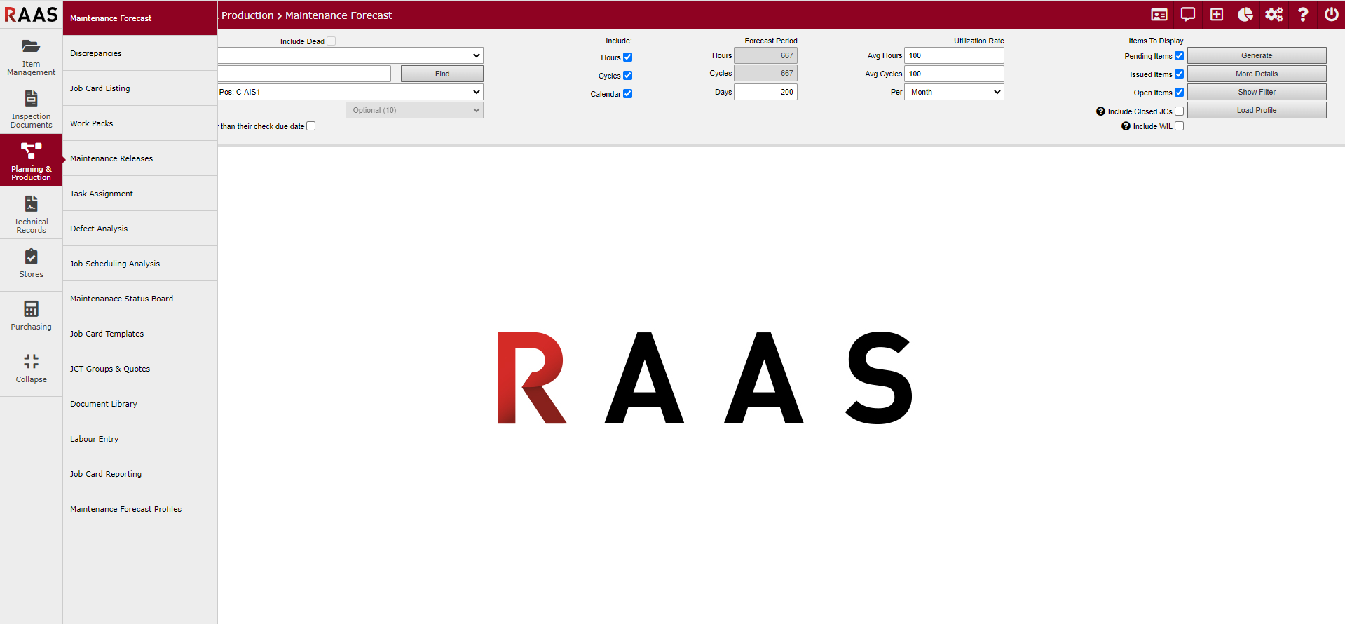 Planning and Production is where all planned maintenance jobs are created, and the bulk of all maintenance activity is controlled. Maintenance in RAAS is based on a Job Card system where each maintenance job is given a card number, and that job card number is used to track the accomplishment of the maintenance job both before and after the fact. A job card need not become a physical item; the job card number and its associated information may only ever exist in data form. The hard-copy job card, if produced, is used by the maintenance engineer to direct the accomplishment of a maintenance job. For more information about the job card numbering system - SEE Job Card Numbering.