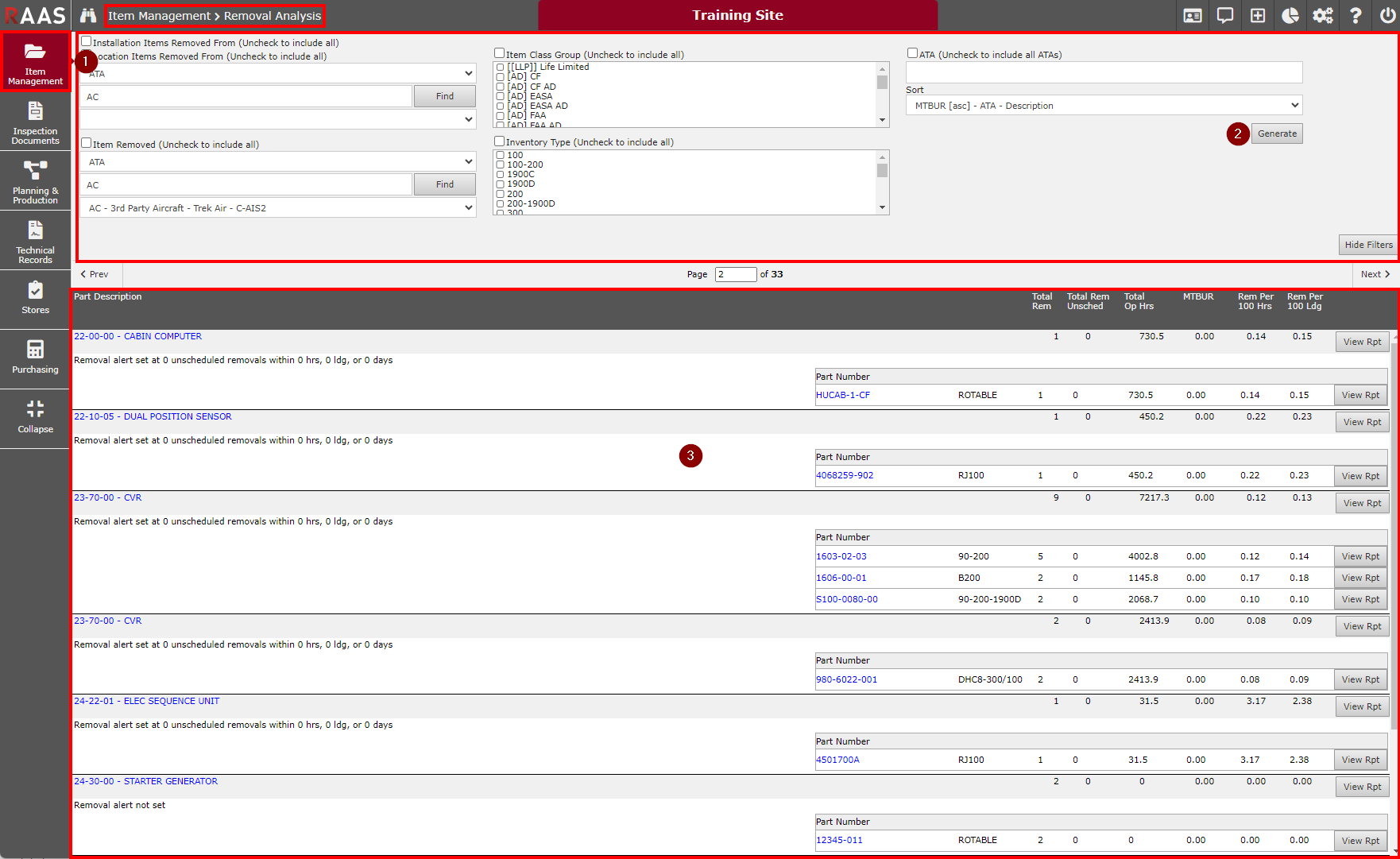 The Removal Analysis screen allows the user to view removals by Installation (an engine for example – lists all parts removed from an engine), Location (an aircraft – lists all parts removed from an aircraft), Item Removed (lists all removals of a particular part), Item Class, Inventory Type, and ATA. Three sort options can be selected depending on the type of analysis being performed. From the report listing, the Rate of Removal Report can be ran for a particular PN or for an alternate PN group by clicking the View Rpt button.