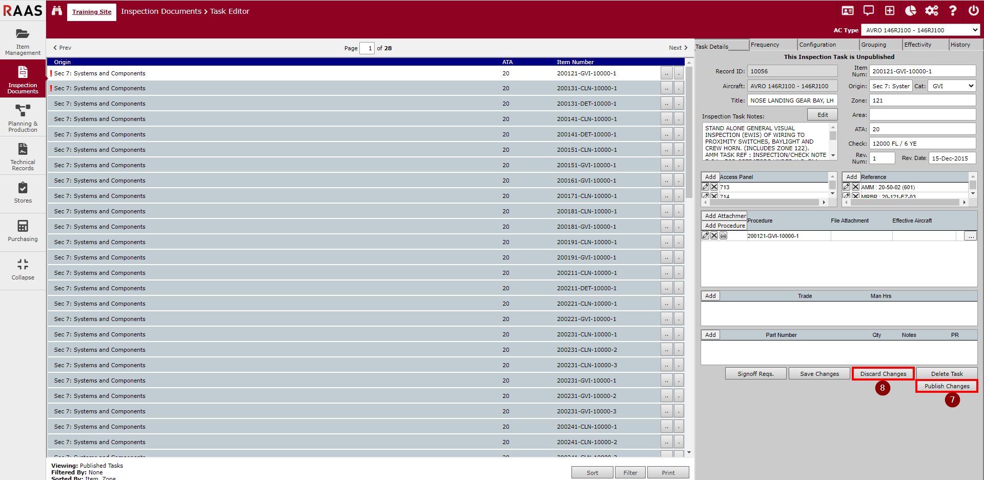 At this point, there will actually be two copies of the task - the existing or "live" copy, and an unpublished copy that is being revised. Tasks that are in revision mode will appear in the Task Editor list with a red exclamation point on the left-hand side of the task line. Only the live copy can be used in Planning and Production for planning purposes.