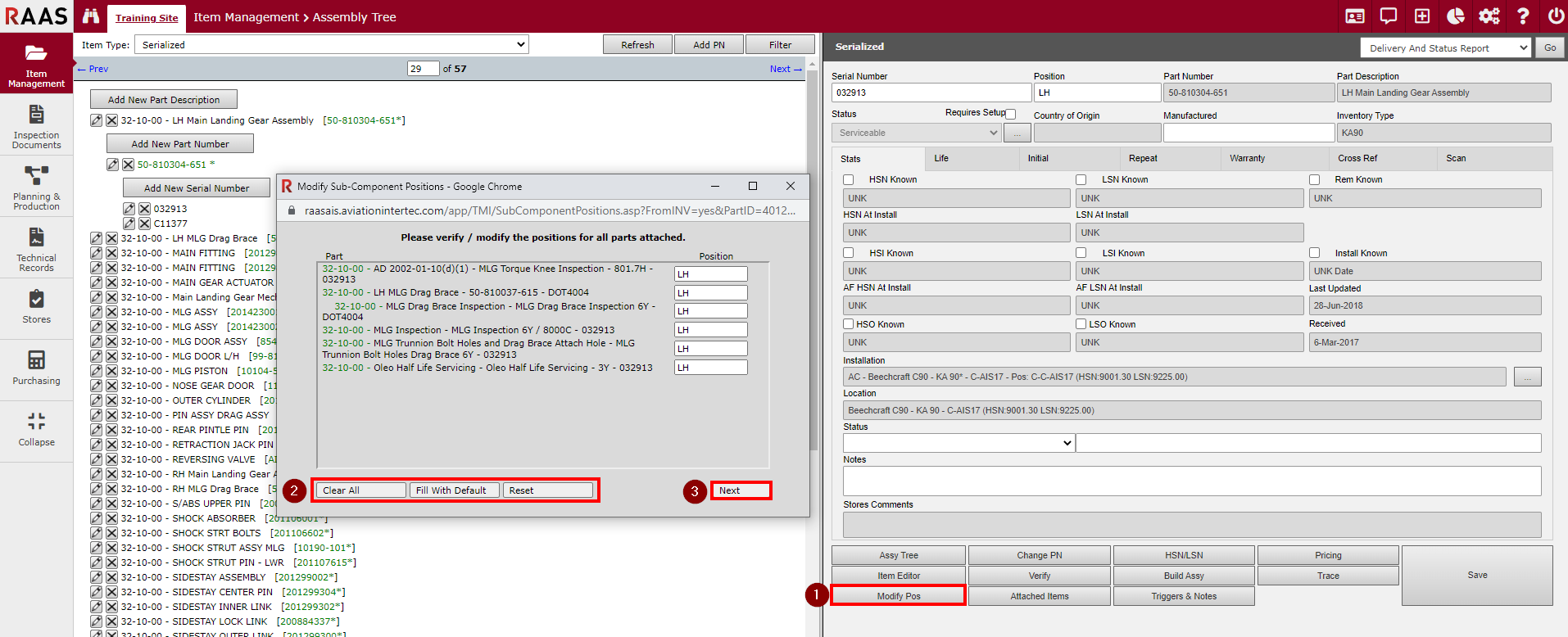 Click the Modify Pos button near the bottom of a serial number. Once clicked, a pop-up window will appear with all parts/inspections attached to the specified serial number.