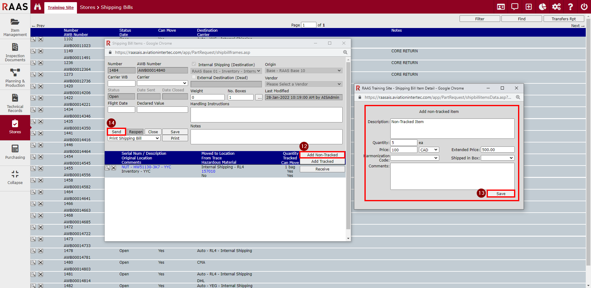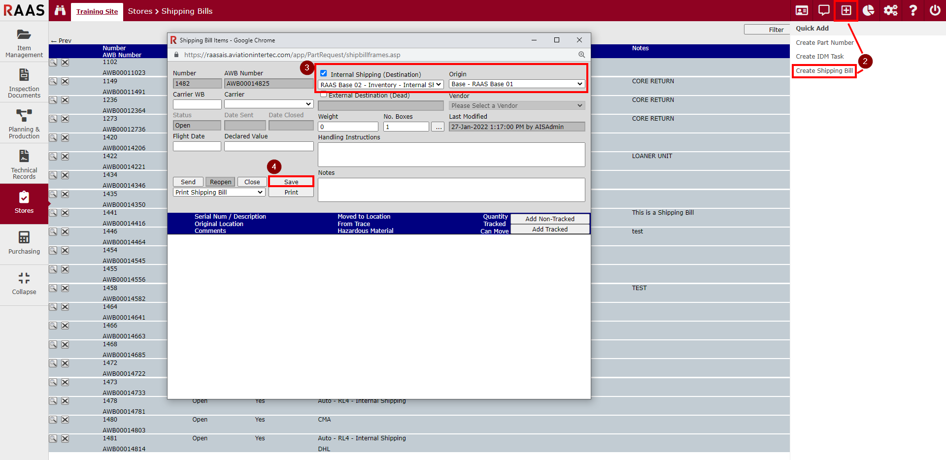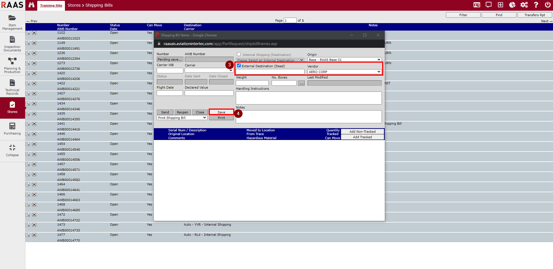 Once the Shipping Bill is saved the Status will be Open, and you can then add items to the Shipping Bill. A Tracked item is a part that is set up in RAAS. A Non-Tracked item can be anything that is not tracked in RAAS. To add a tracked item, click Add Tracked.
