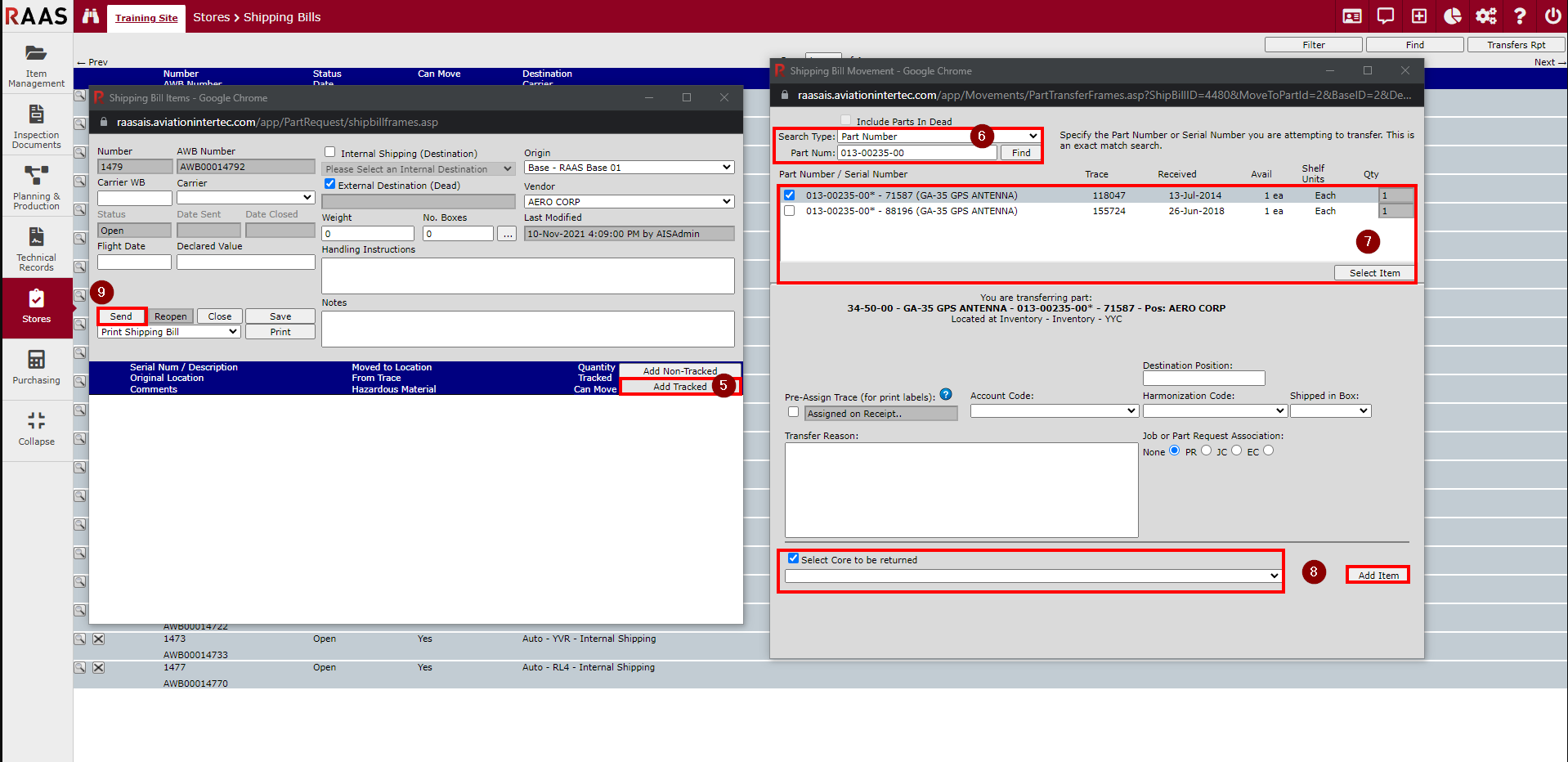 Figure 5: Creating a Shipping Bill for a Core Return Steps 5-9