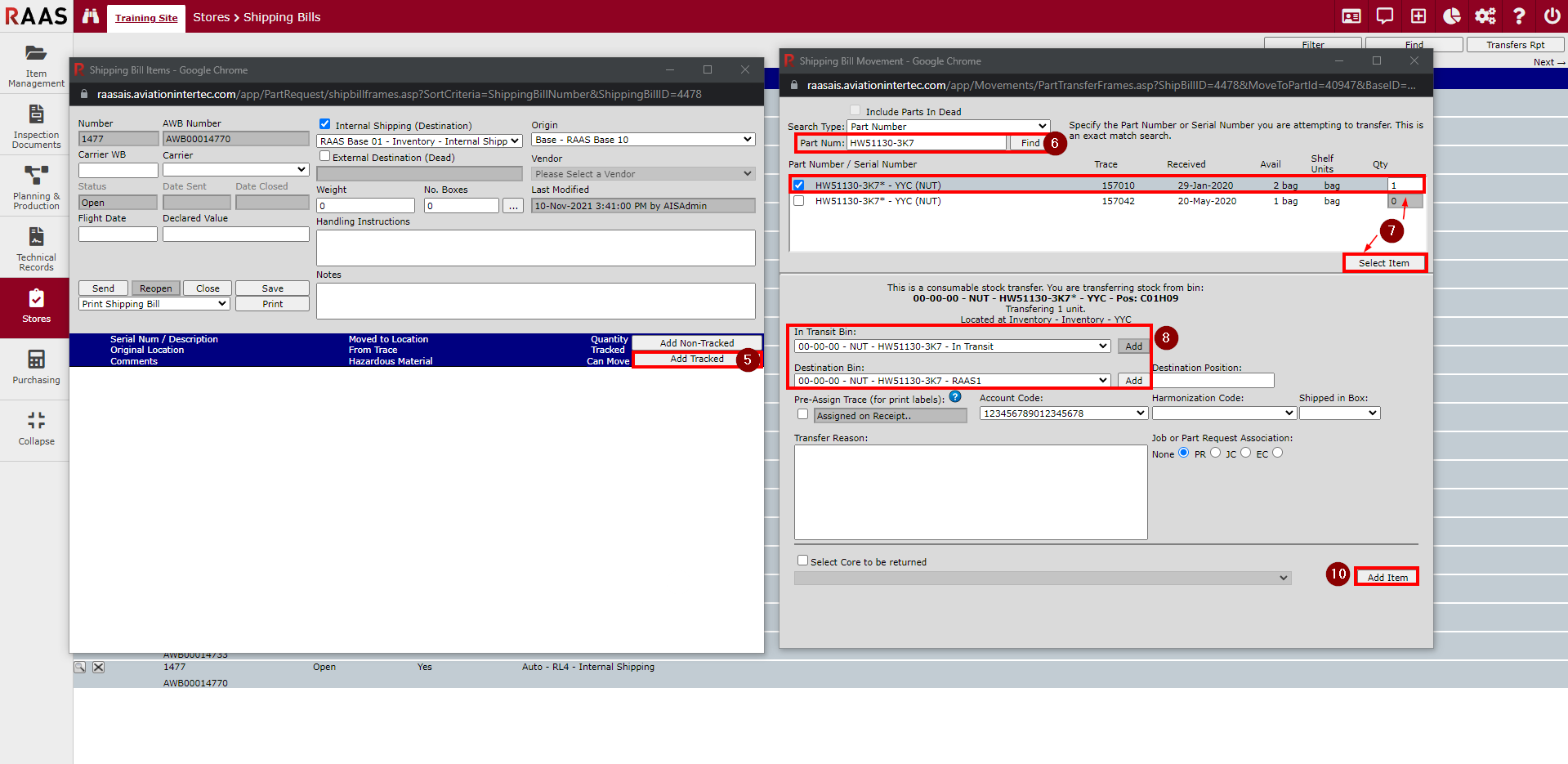 If there are any other tracked items to be added to the Shipping Bill, follow steps 4-9 above until they are all added.