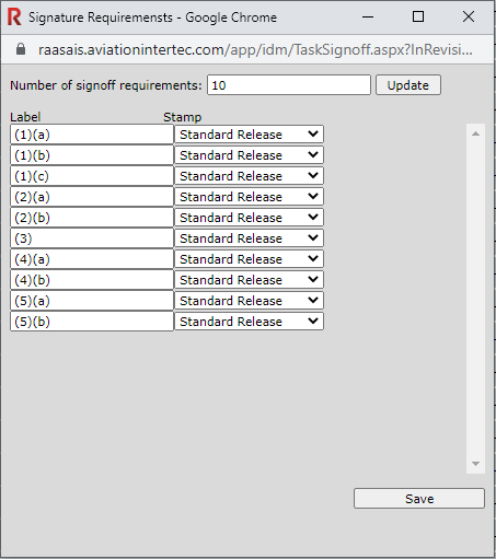 Signoff Requirements - If task compliance requires multiple signatures, they are defined by clicking the Signoff Reqs. button either on the Task Details tab or by clicking the pencil icon in the File Attachment area. This opens the Edit File Attachment pop-up window. From here, click Signoff Req. Next, enter the number of signatures required and click Update. Label each signature requirement and select the required Stamp from the dropdown. Stamps are defined in Options - Stamps. The Signoff Reqs. option can be used to define signatures required for each task step.