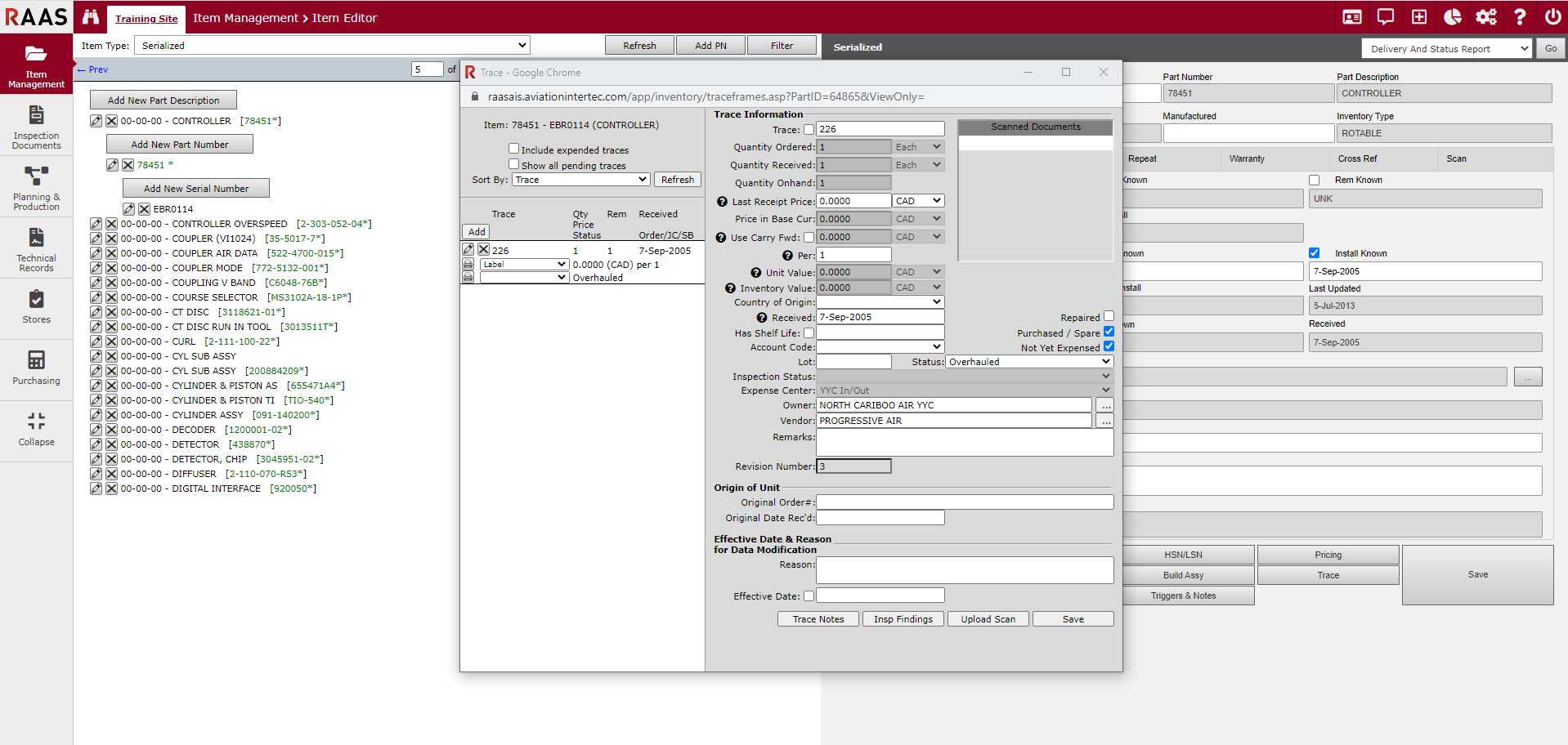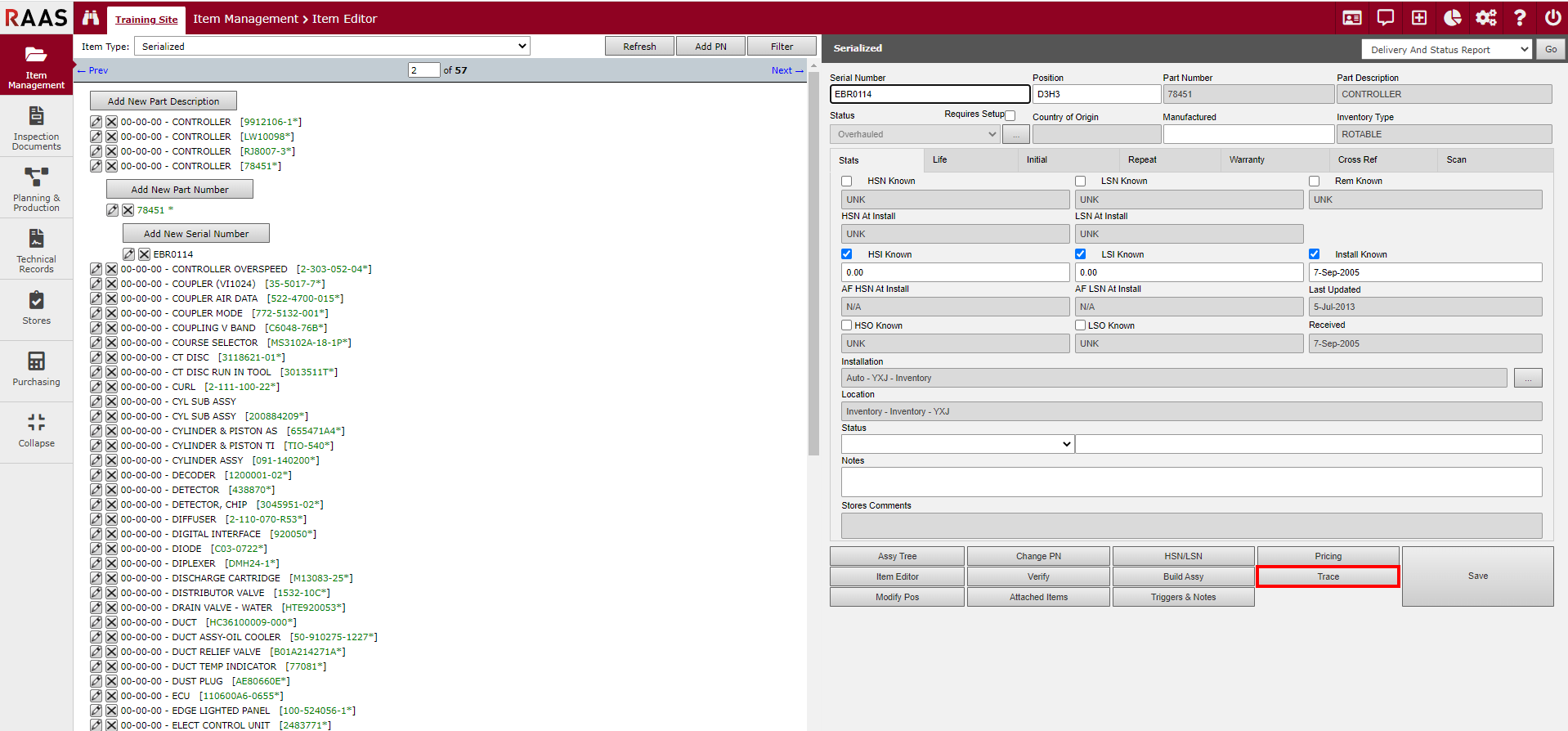 A Trace is a number or description that is given to all items at the time they are received - see PURCHASING - ORDERS. The Trace allows an item, or group of items, under a serial number to be traced back to the vendor.
