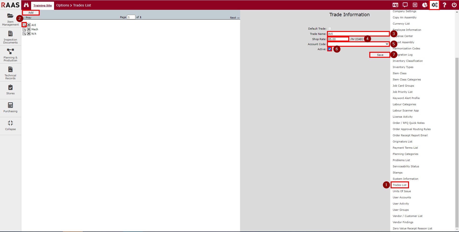 Trades can be added to the Trades List in RAAS for use in labour tracking. Each Trade can have a Shop Rate and Account Code assigned to it.