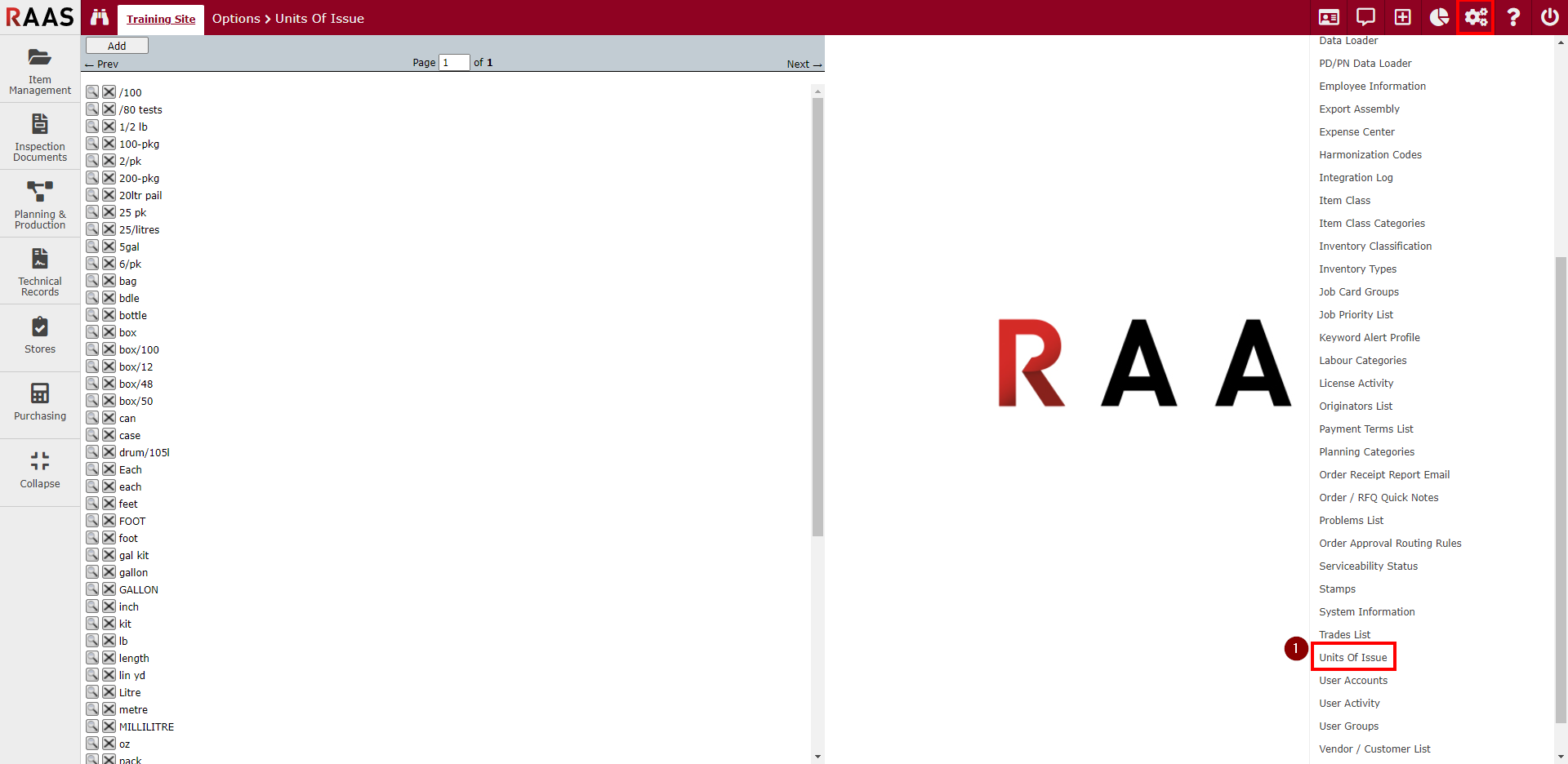 Click on the gears icon on the top right corner to open Settings and select Units of Issue.