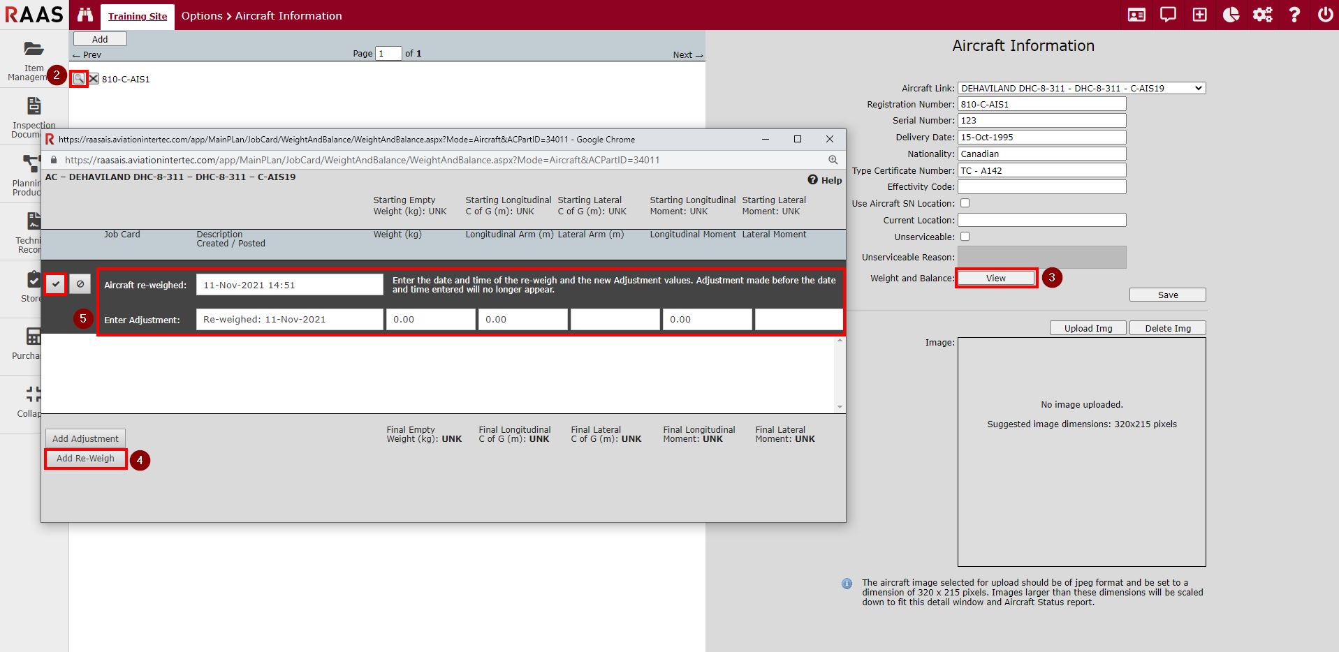 In the Weight & Balance popup window click the Add Re-Weigh button.