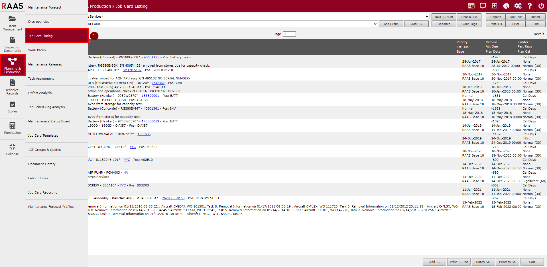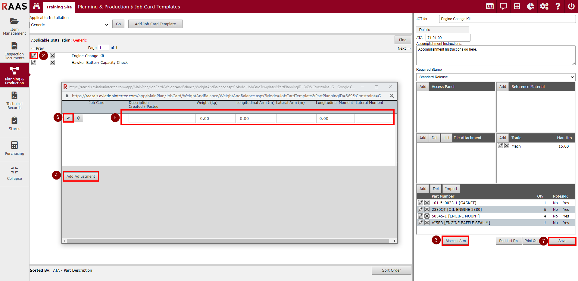 RAAS allows Job Card Templates (JCTs) to specify weight & balance adjustments. An example of this is the installation or removal of optional equipment or changes to aircraft configuration that alter airframe weight & balance.