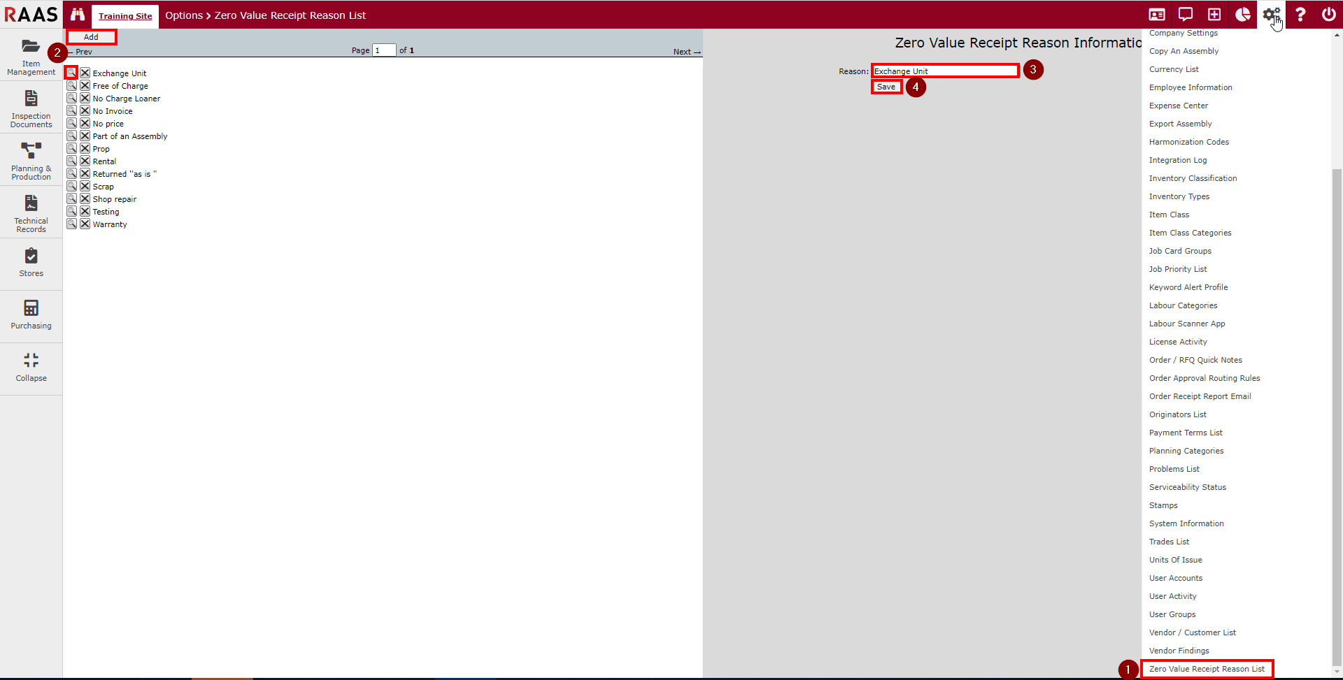 In order to receive an item with zero value in RAAS, a reason must be selected. These reasons can be set up using the Zero Value Receipt Reason List options editor.